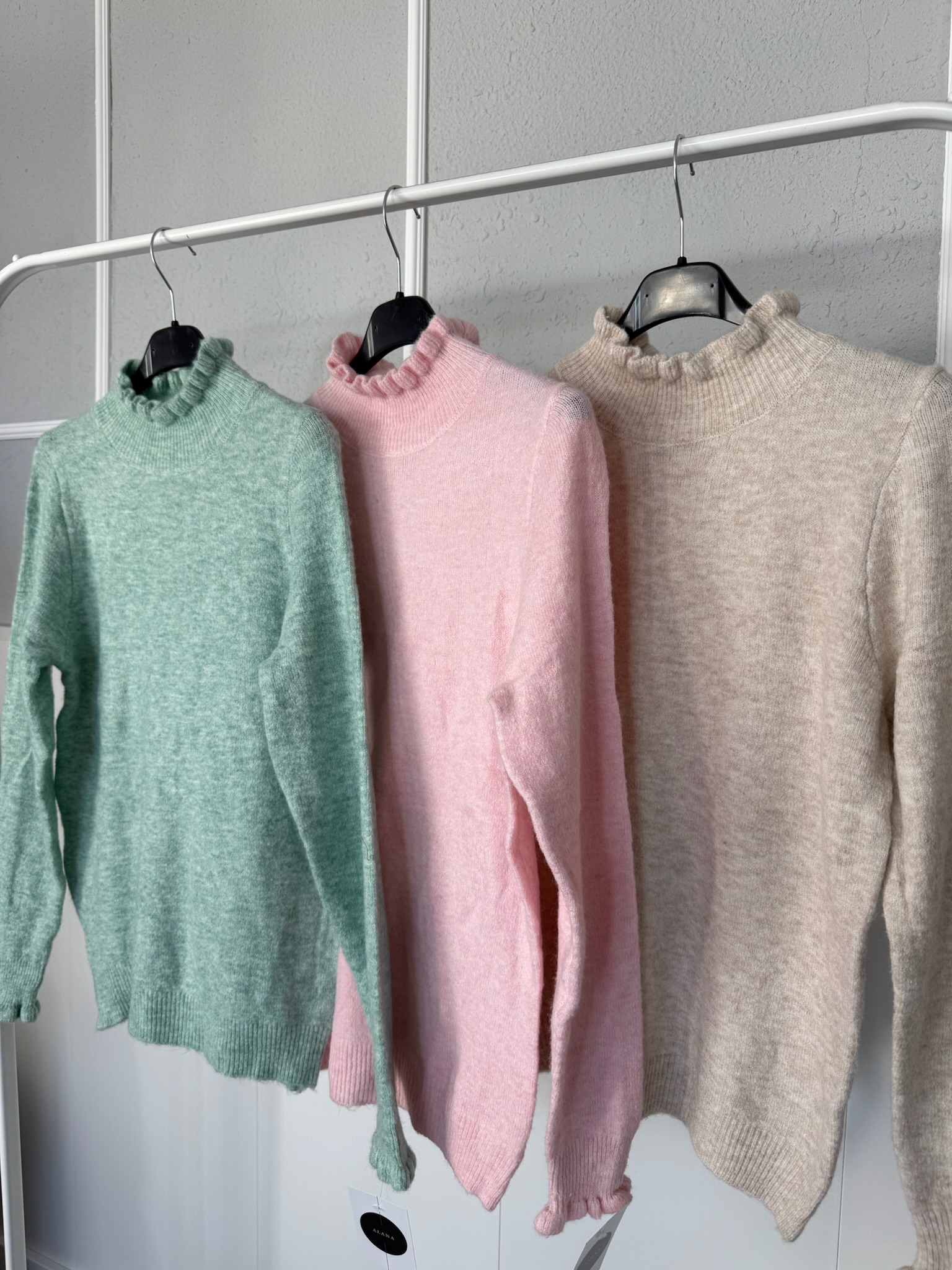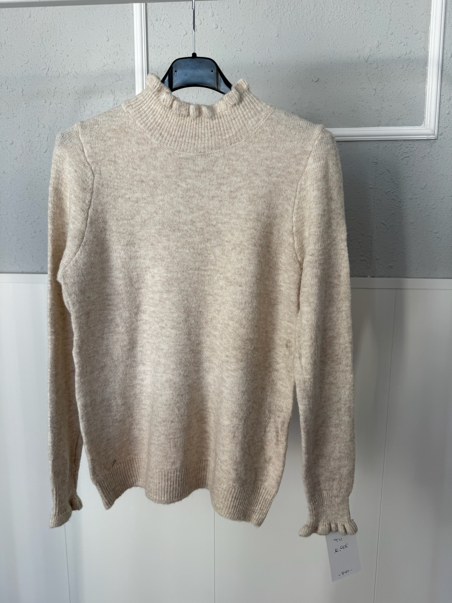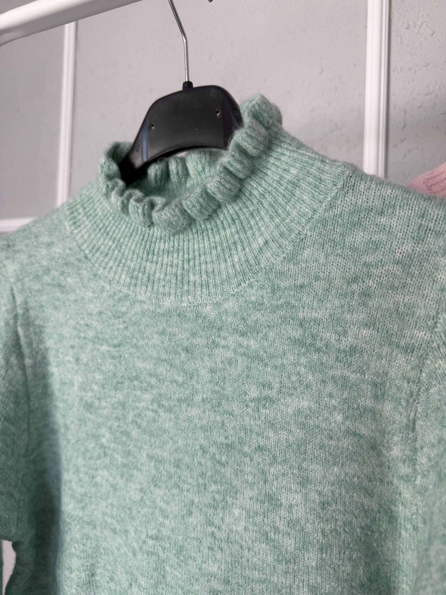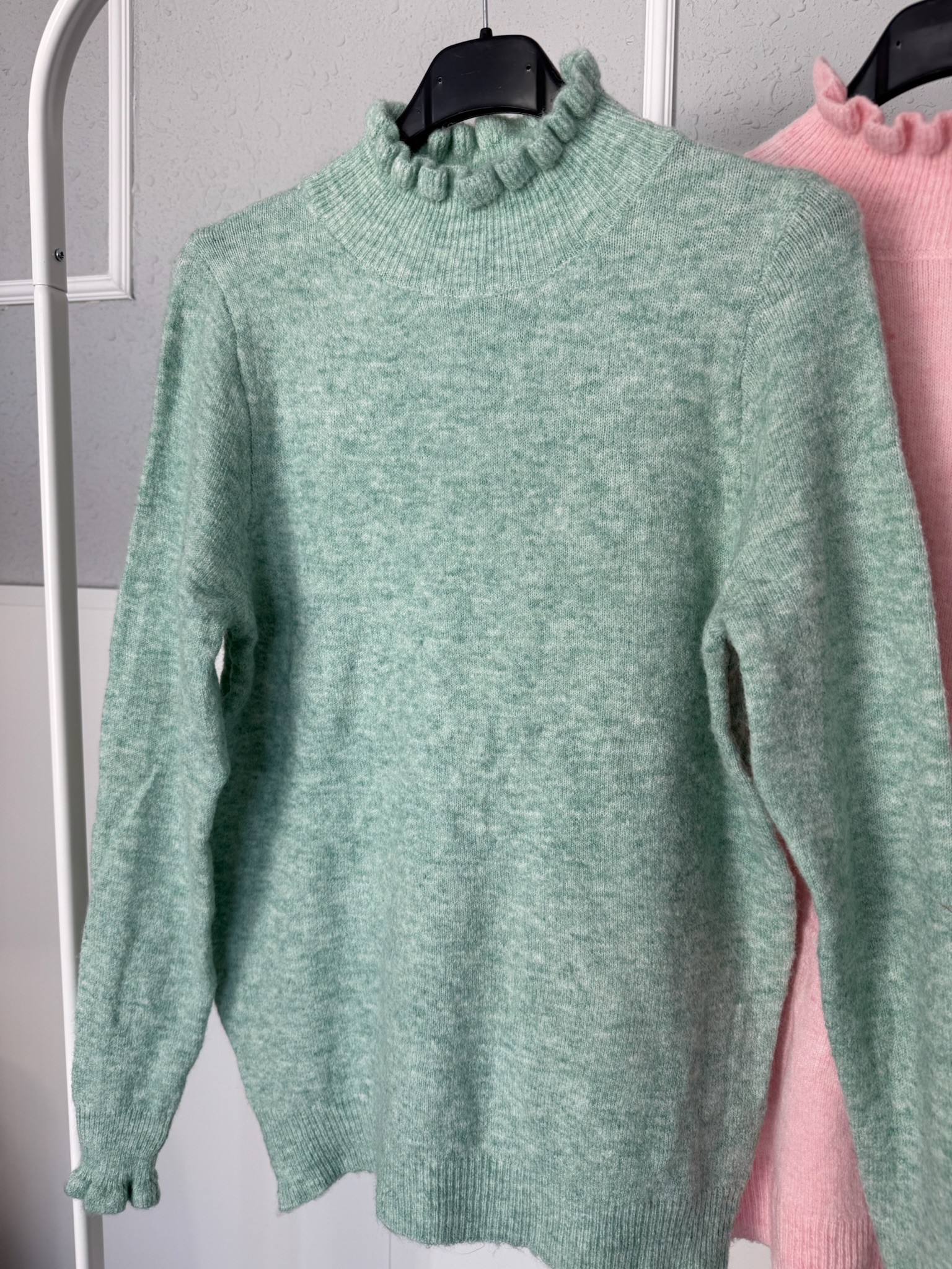 Jersey básico con detalle de volante en el cuello subido y en la manga, con un tejido muy suave. Se adapta perfectamente al cuerpo pero no se pega.