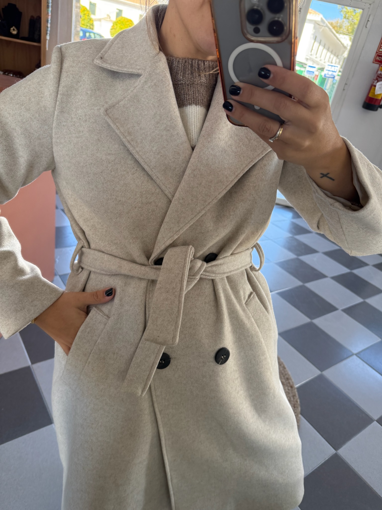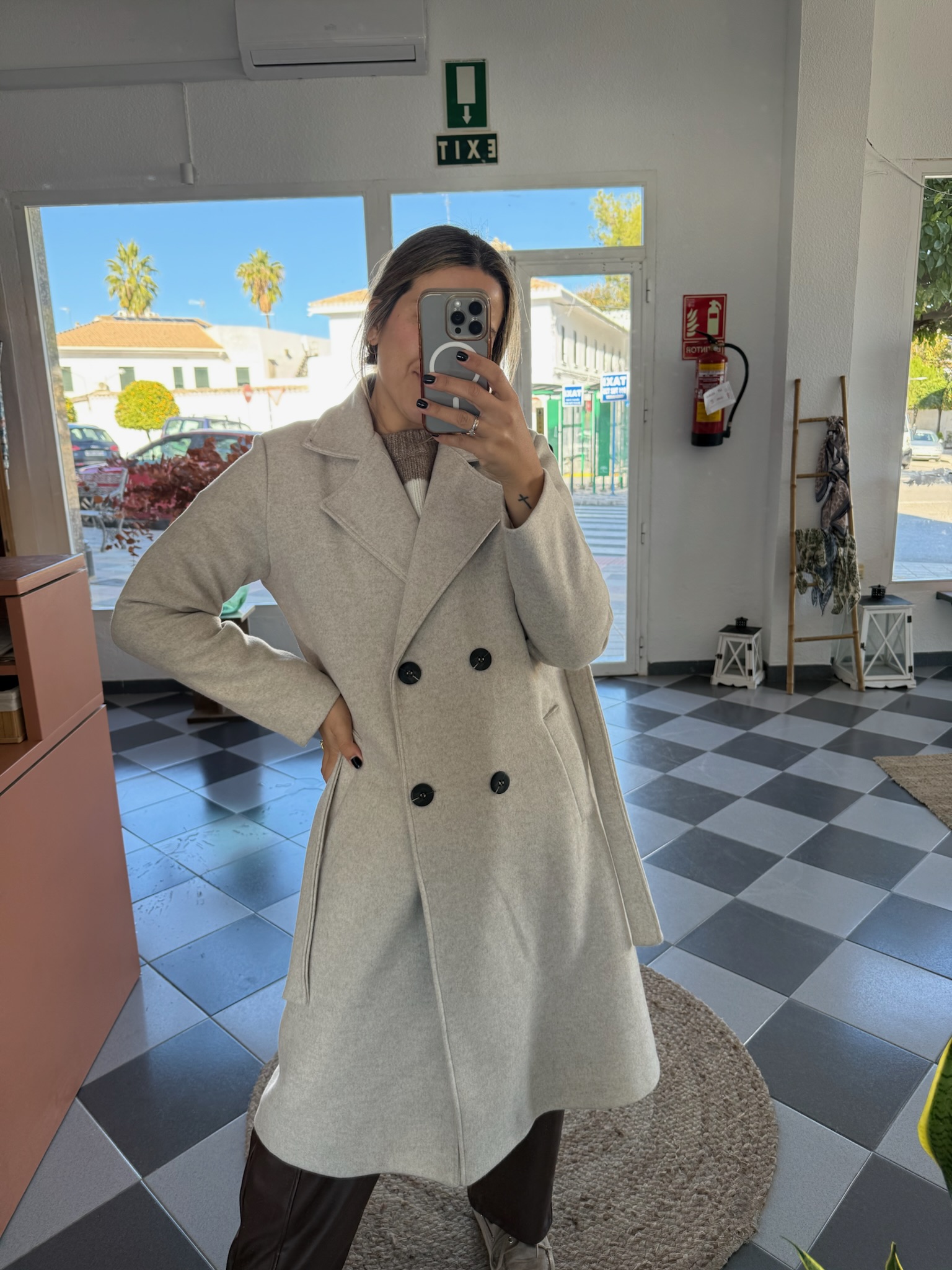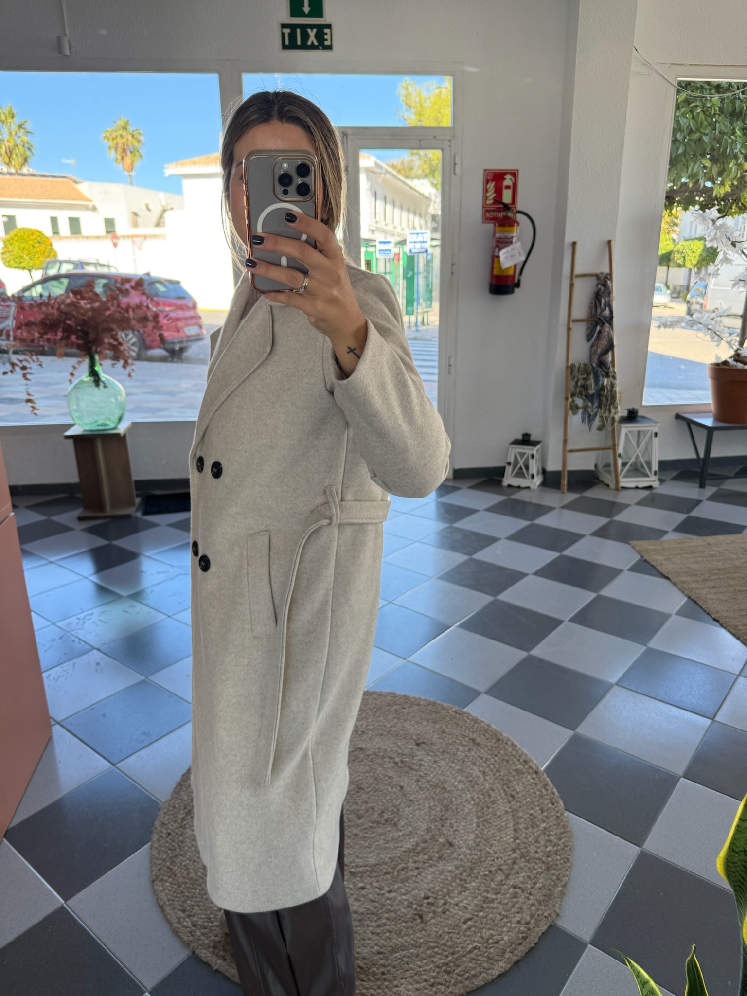 Abrigo de lana cruzado de corte MIDI con solapas y detalle de cinturones para ajustarlo en la cintura. Doble botonadura. Talla amplio.