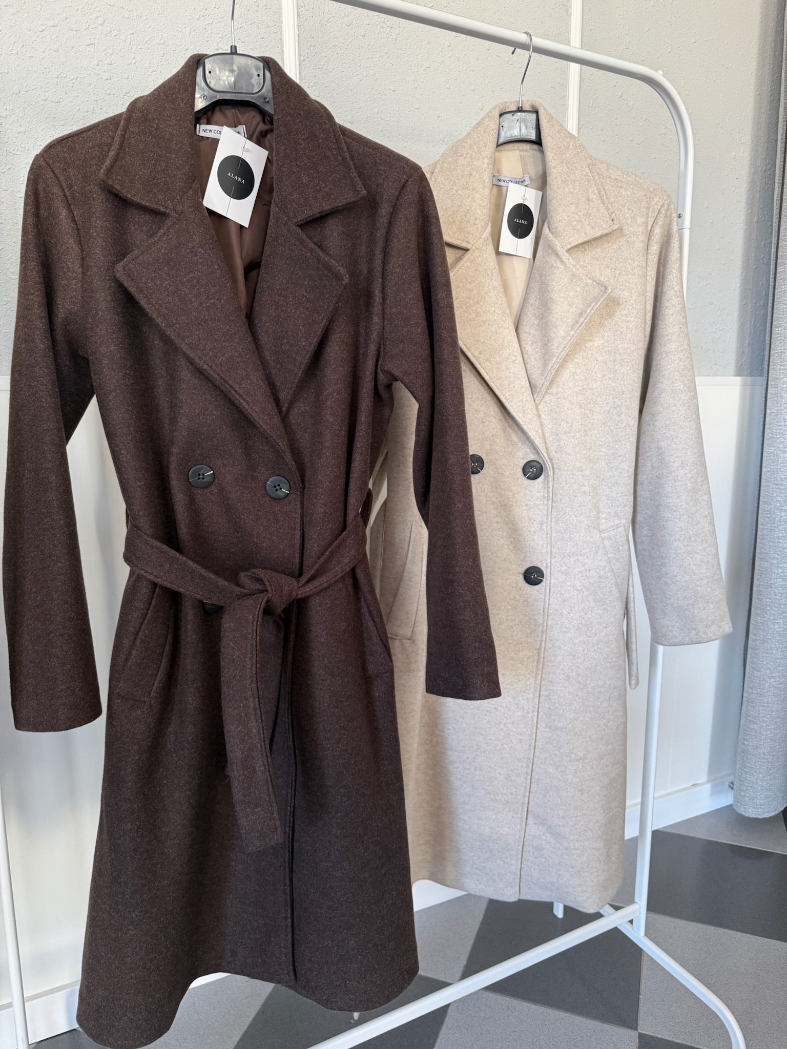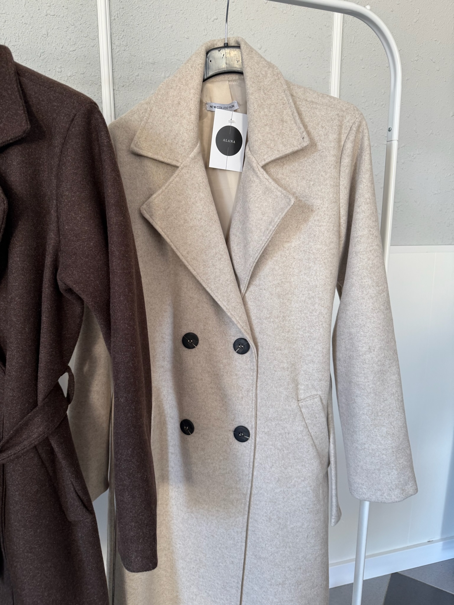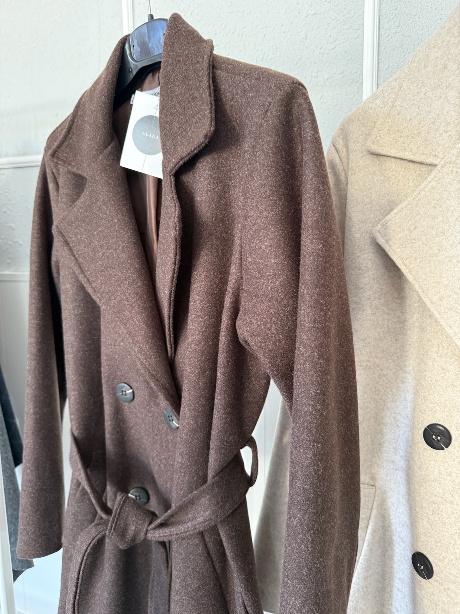 Abrigo de lana cruzado de corte MIDI con solapas y detalle de cinturones para ajustarlo en la cintura. Doble botonadura. Talla amplio.