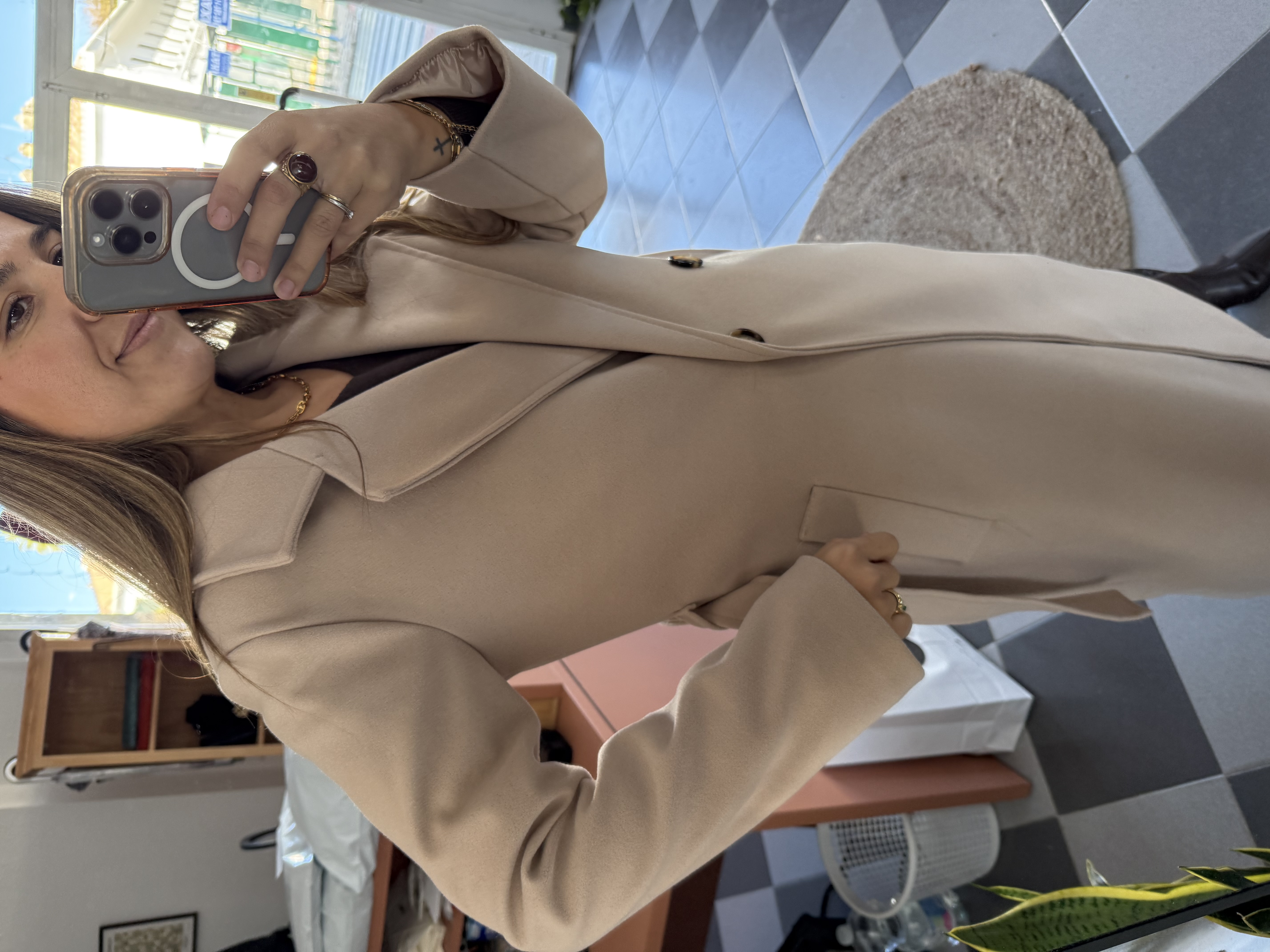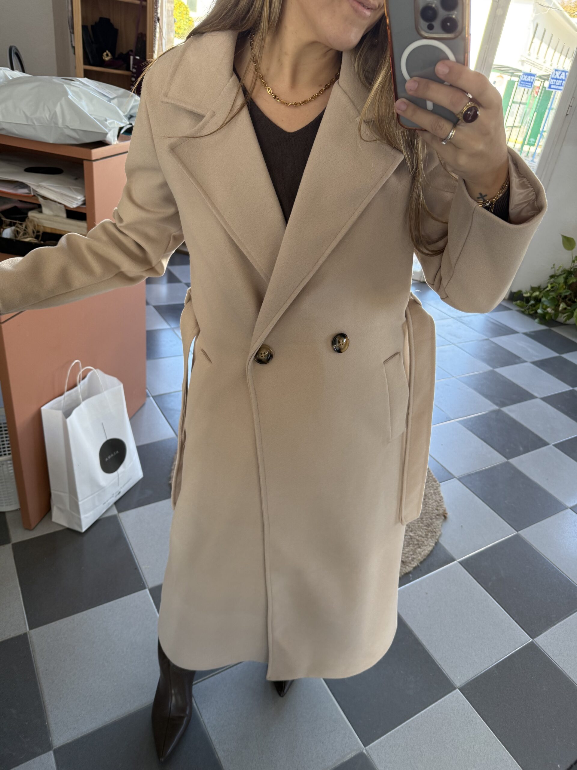 Abrigo largo en color beige de paño, cruzado y con opción de ponerle el cinturón para marcar la cintura. Solapas grandes. Talla única.