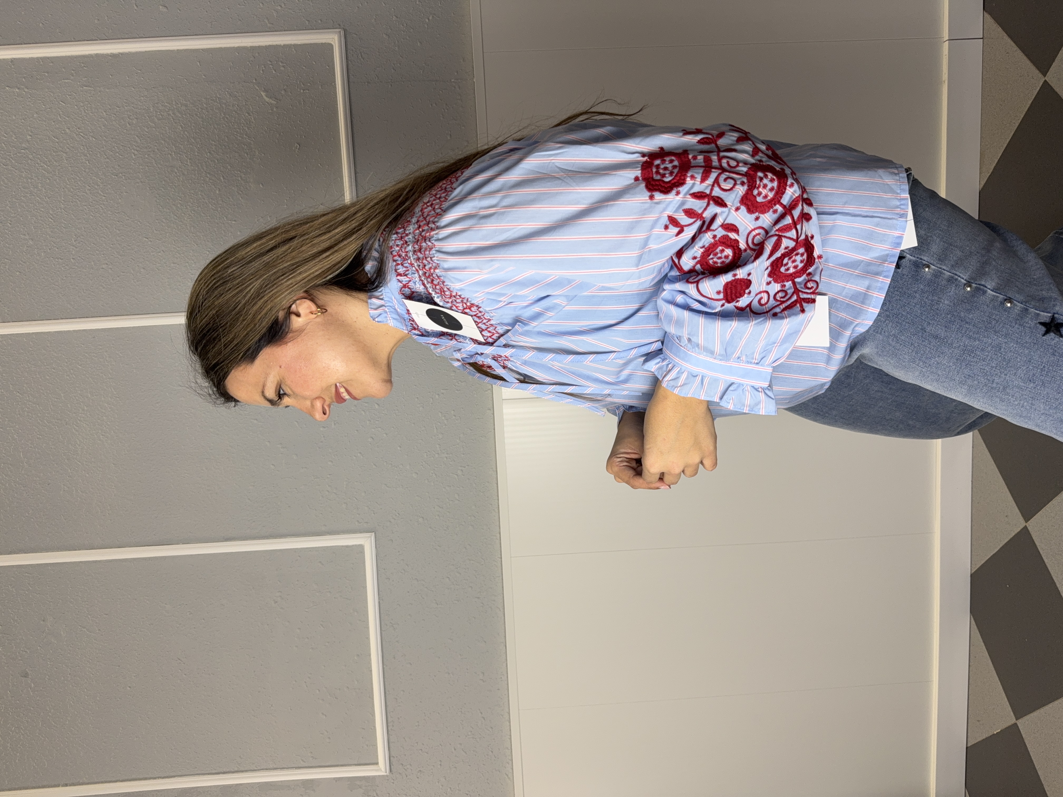Blusa azul rayas con bordados en rojo