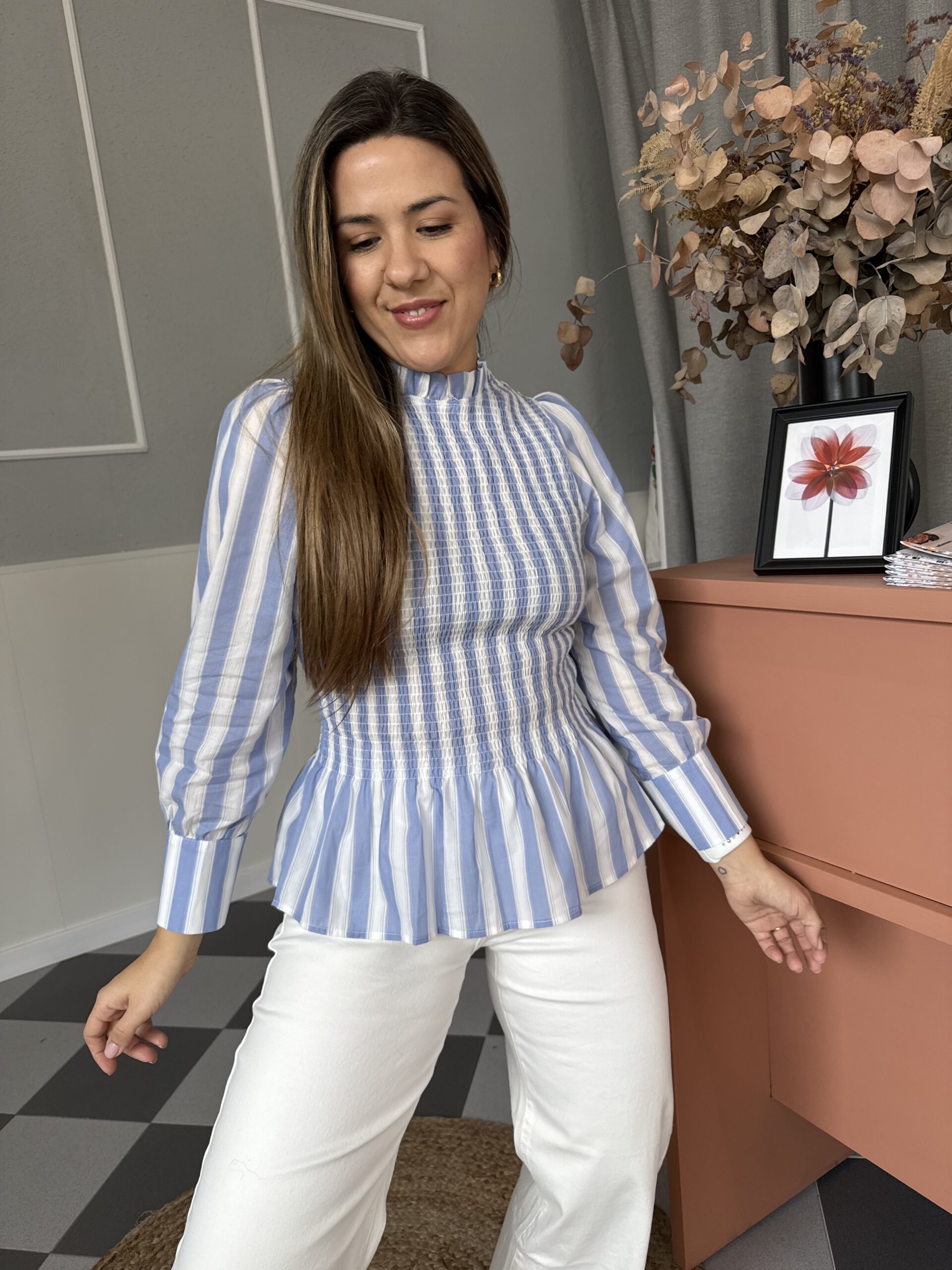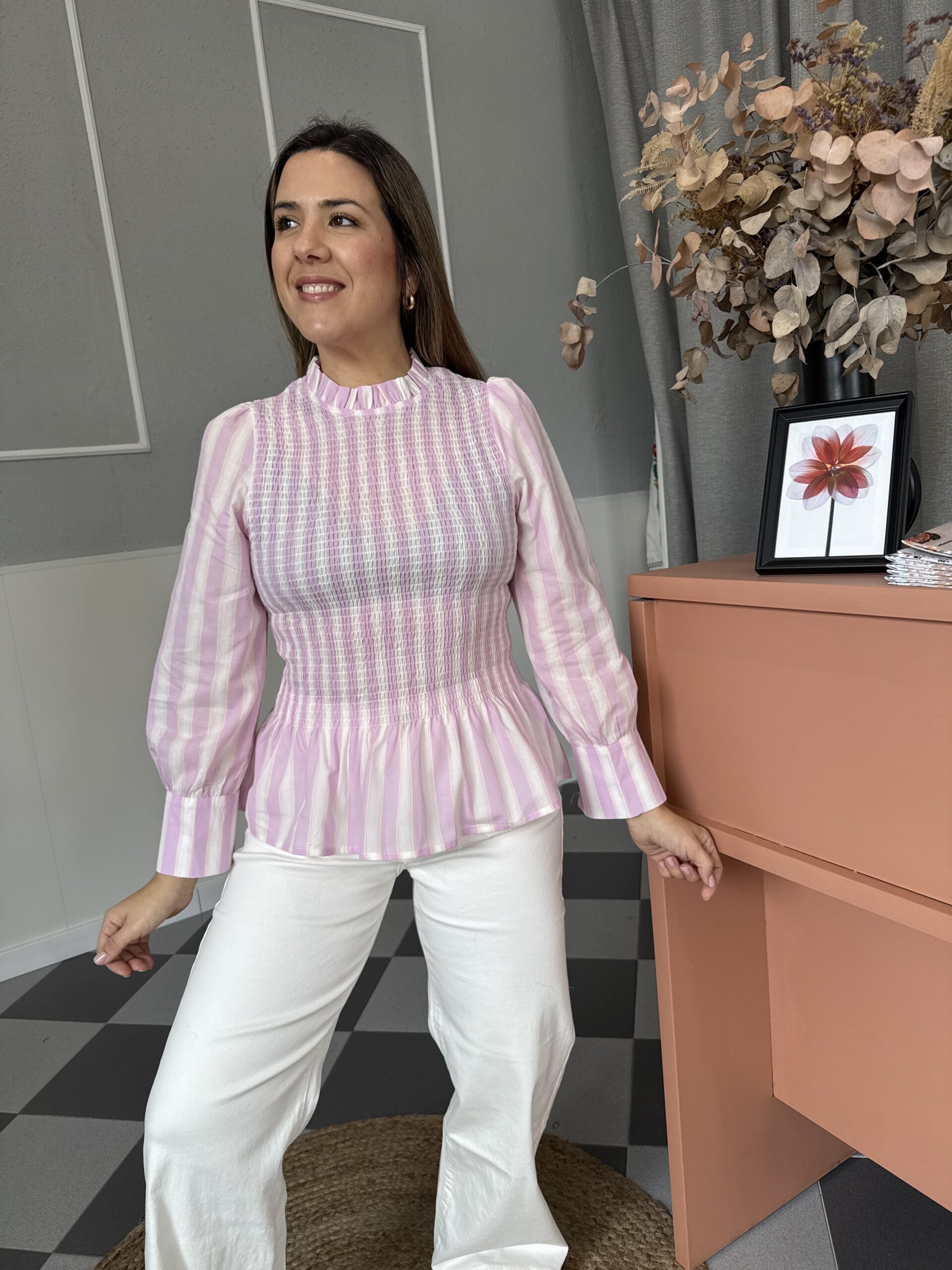 Blusa con pecho nido de abeja y volante en el bajo. Con manga abullonada.
