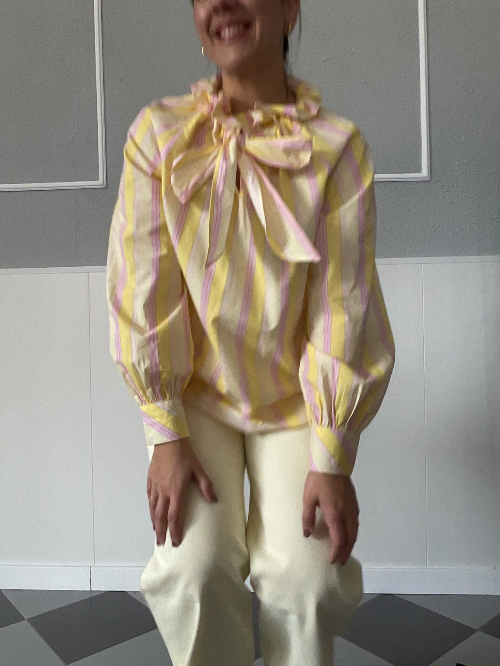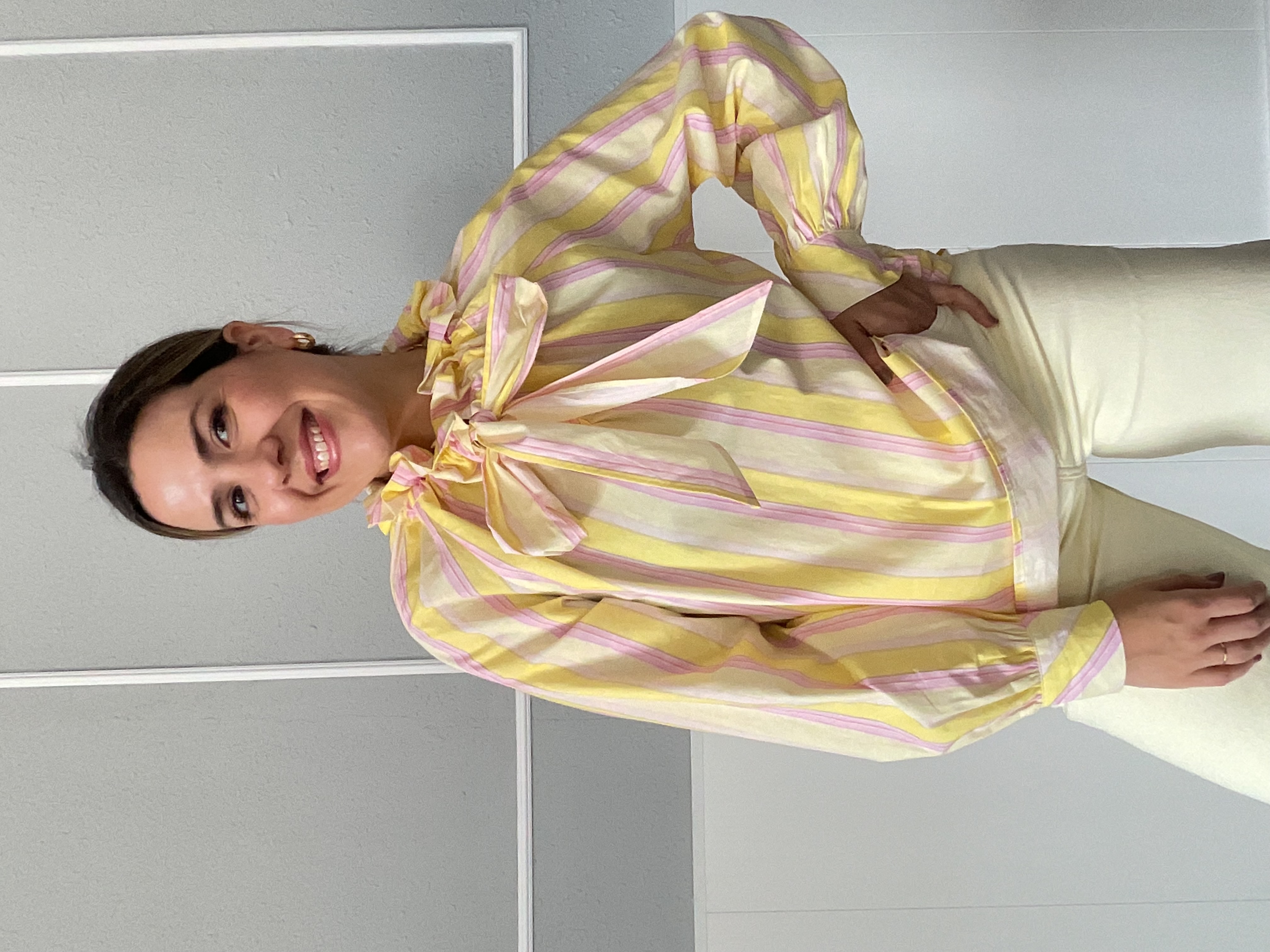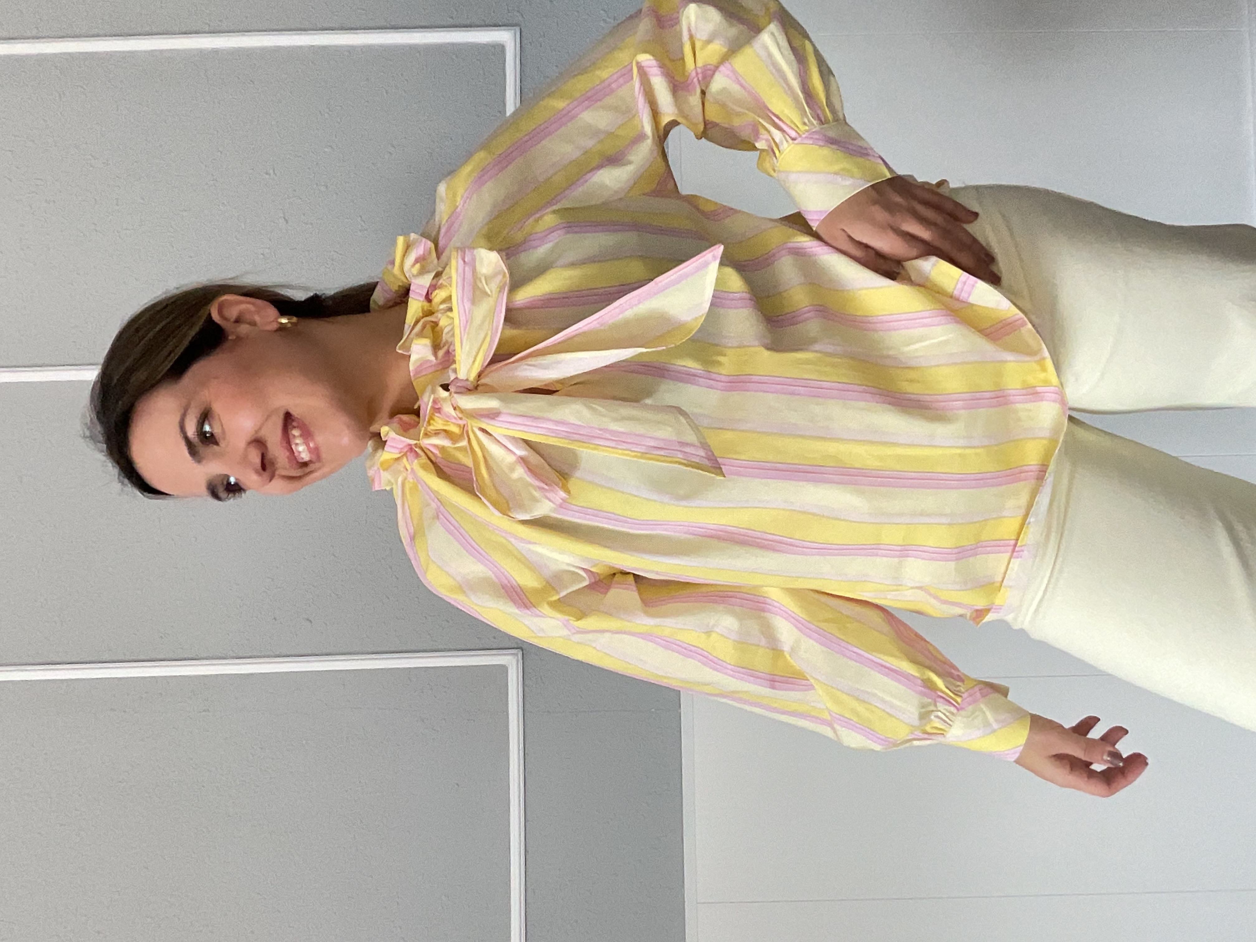 Blusa de rayas en color rosa y amarillo con detalle del cuello subido que favorece mucho. Ideal para dar un toque de color a tu look.
