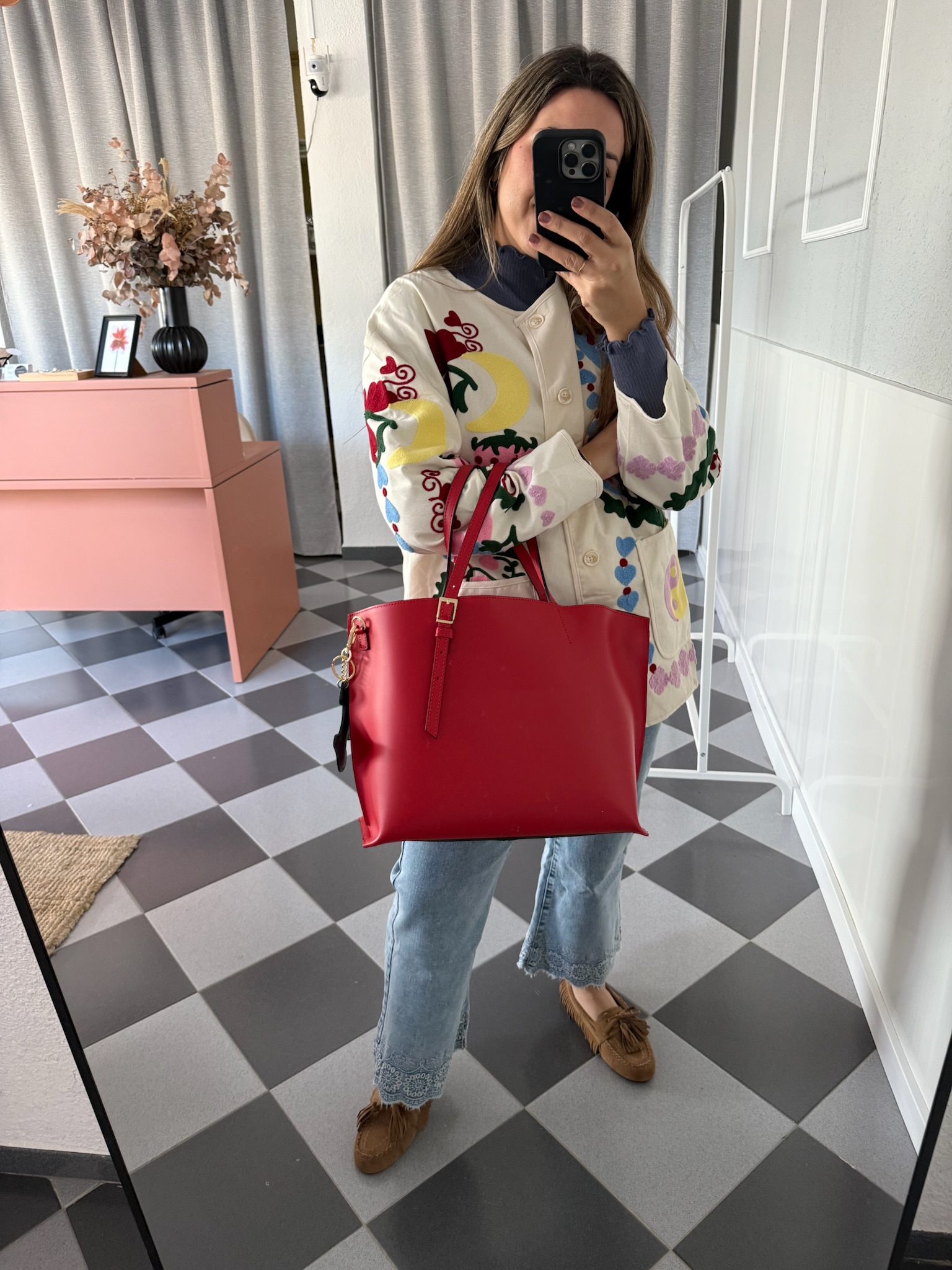 Bolso de piel en color rojo intenso con asa para colgar al hombro, interior con varios bolsillos, un bolso para siempre y para todo. El llavero es un accesorio a parte.