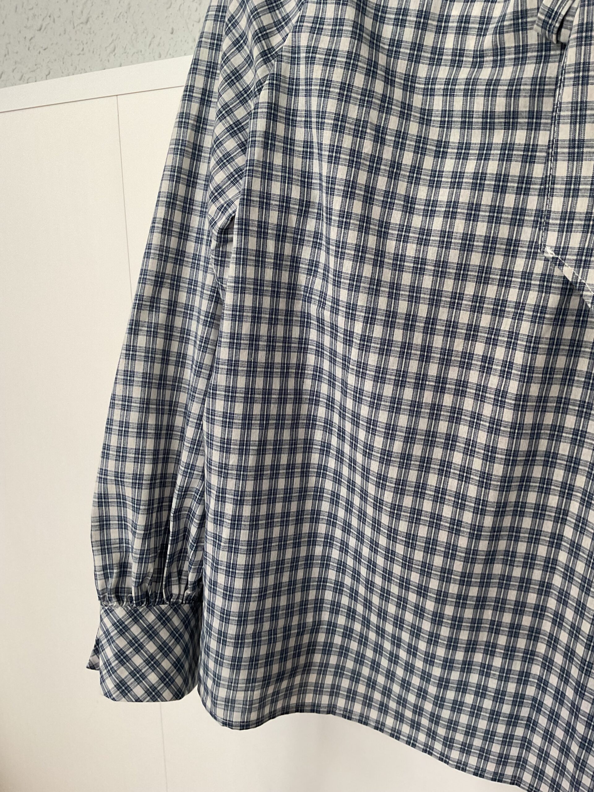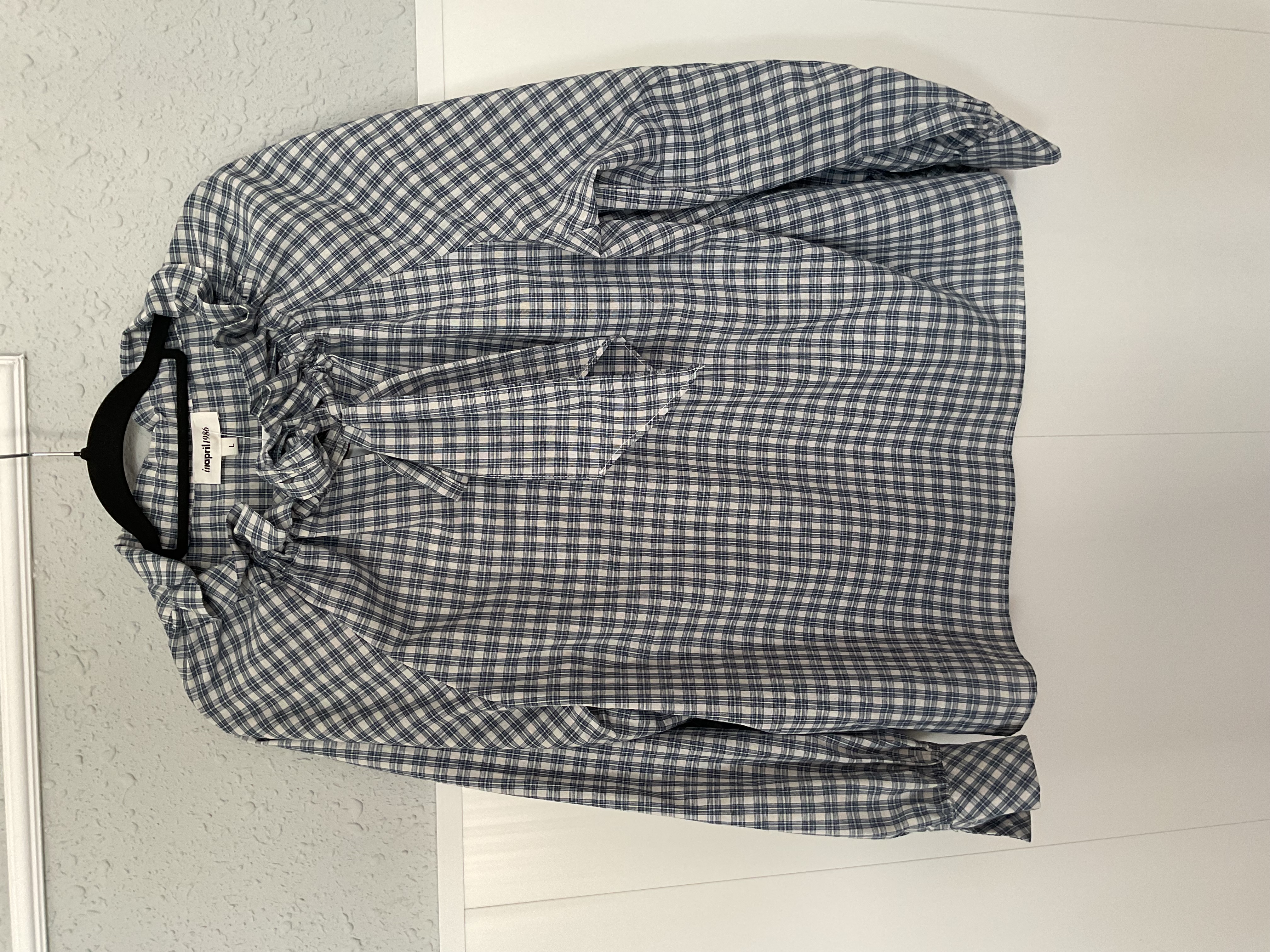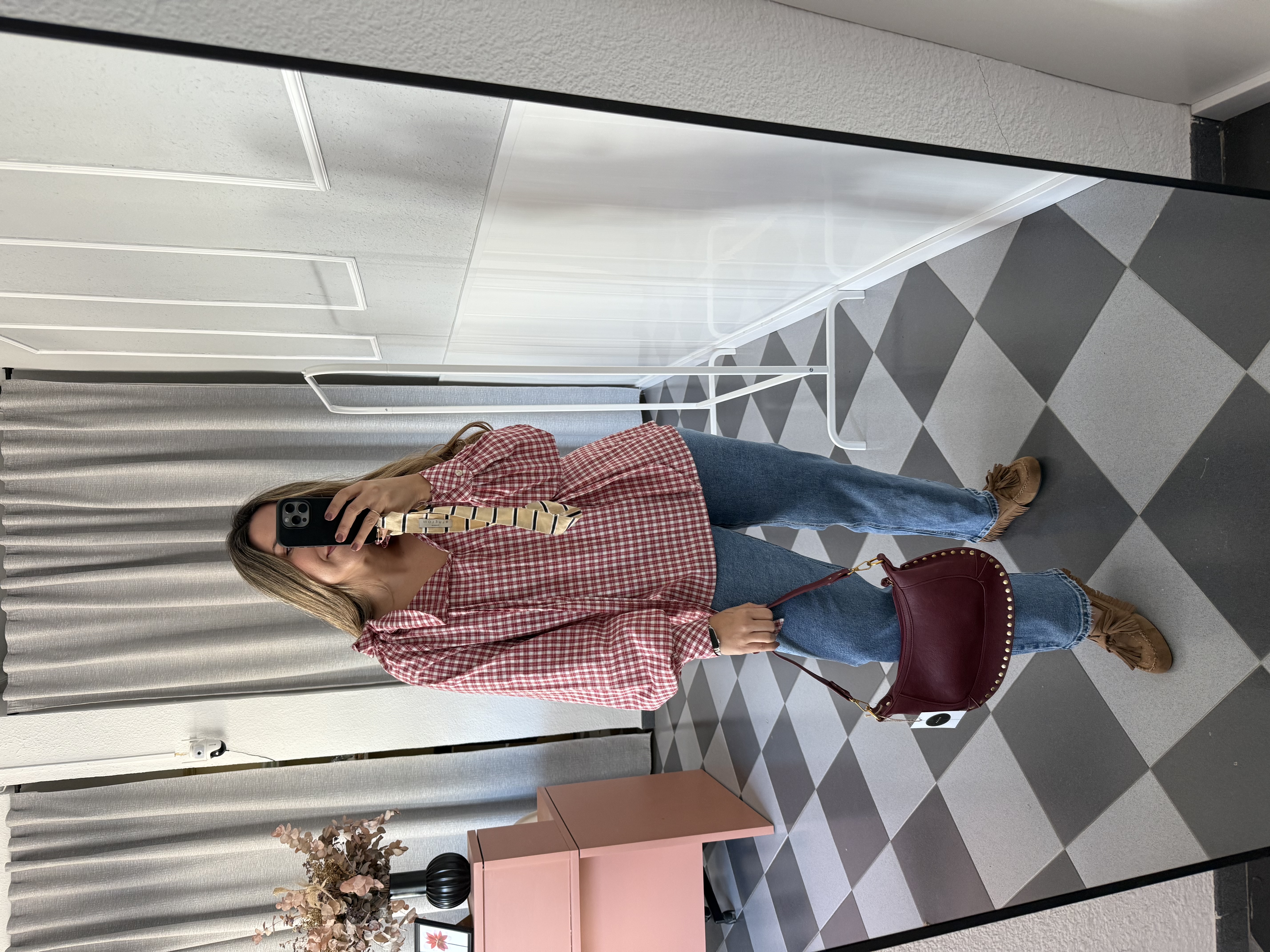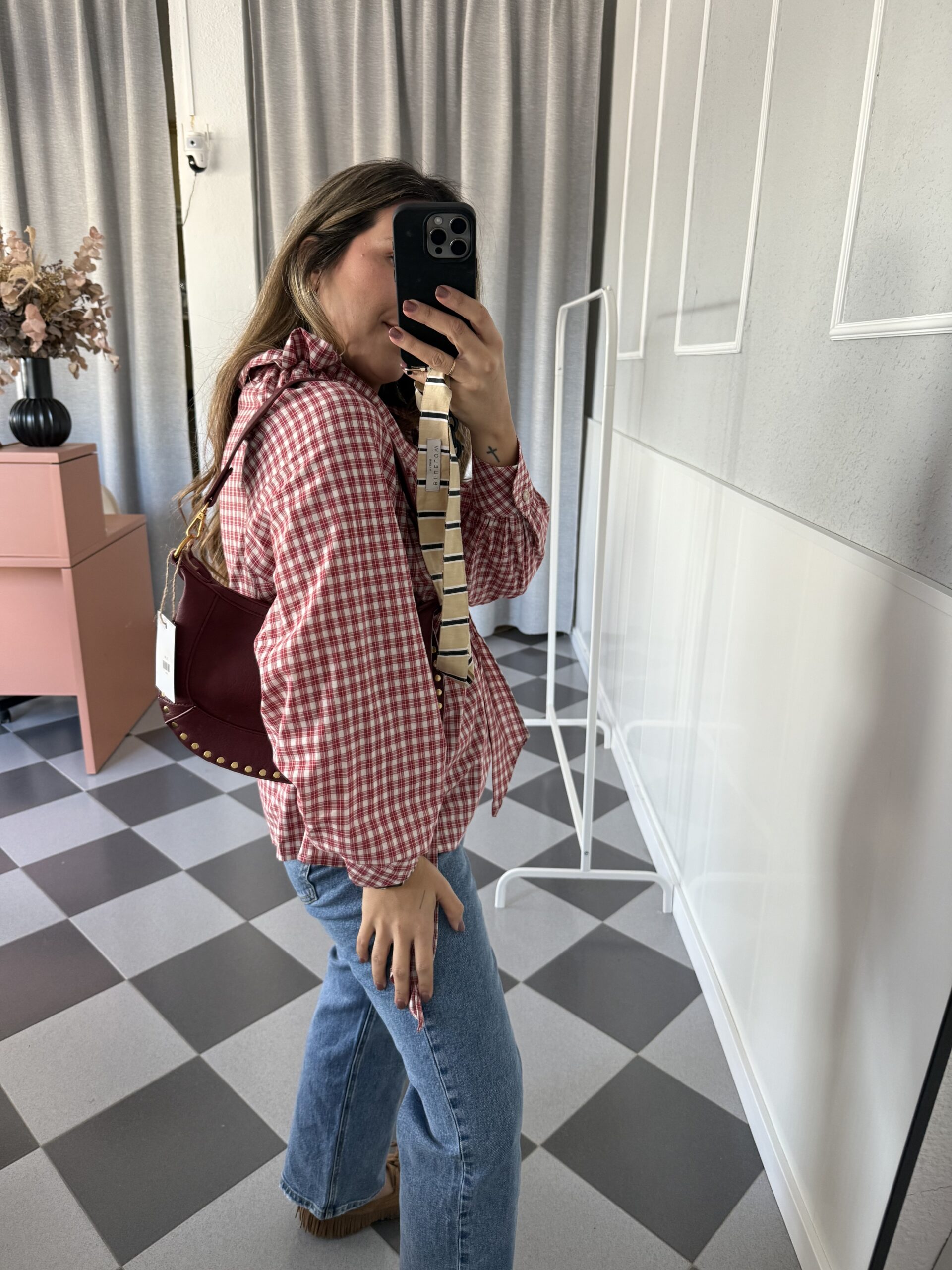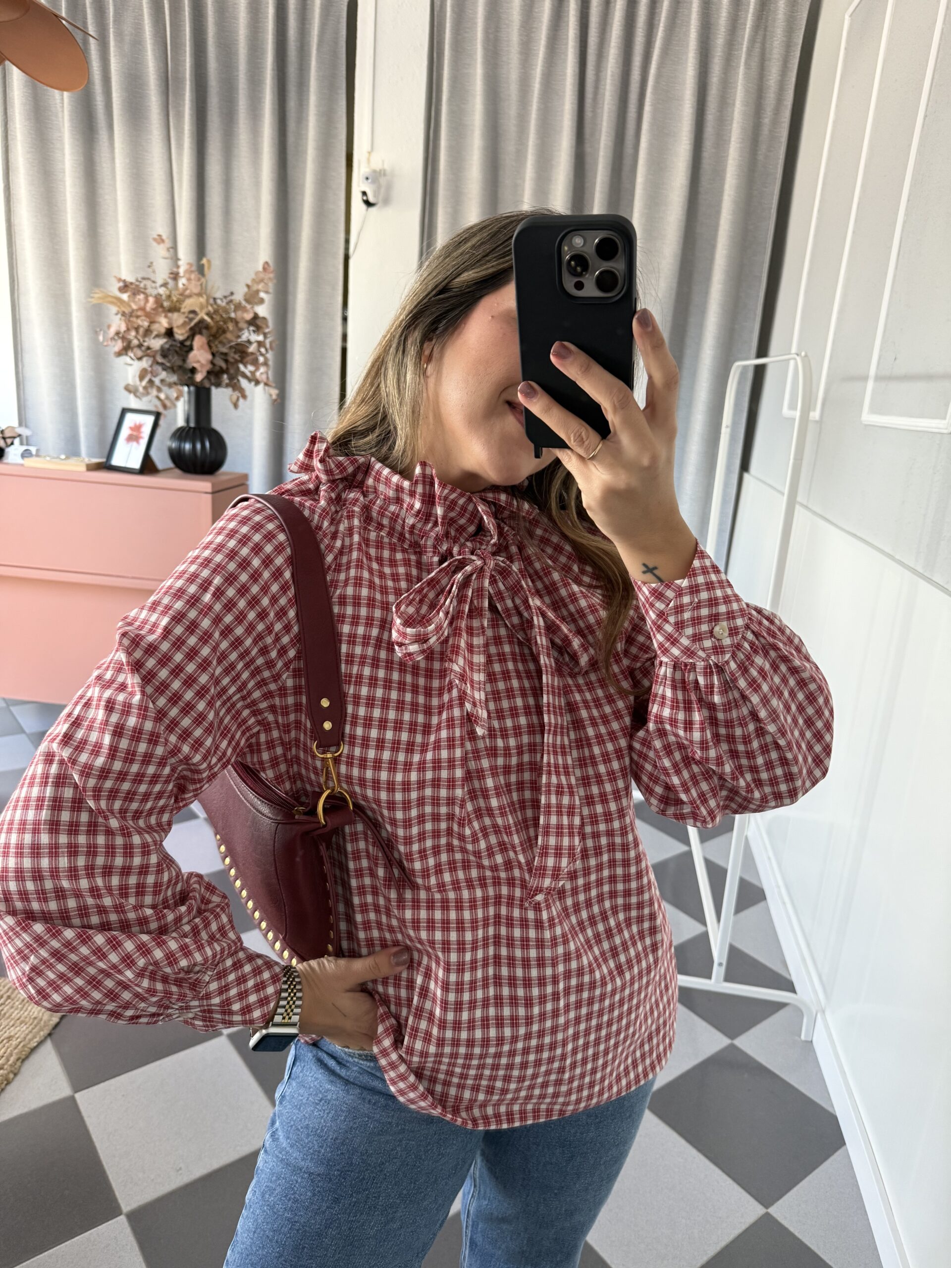 Camisa en tonos rojos de cuadros con el detalle del cuello rizado para hacer lazada. O dejarlo suelto con escote de pico.