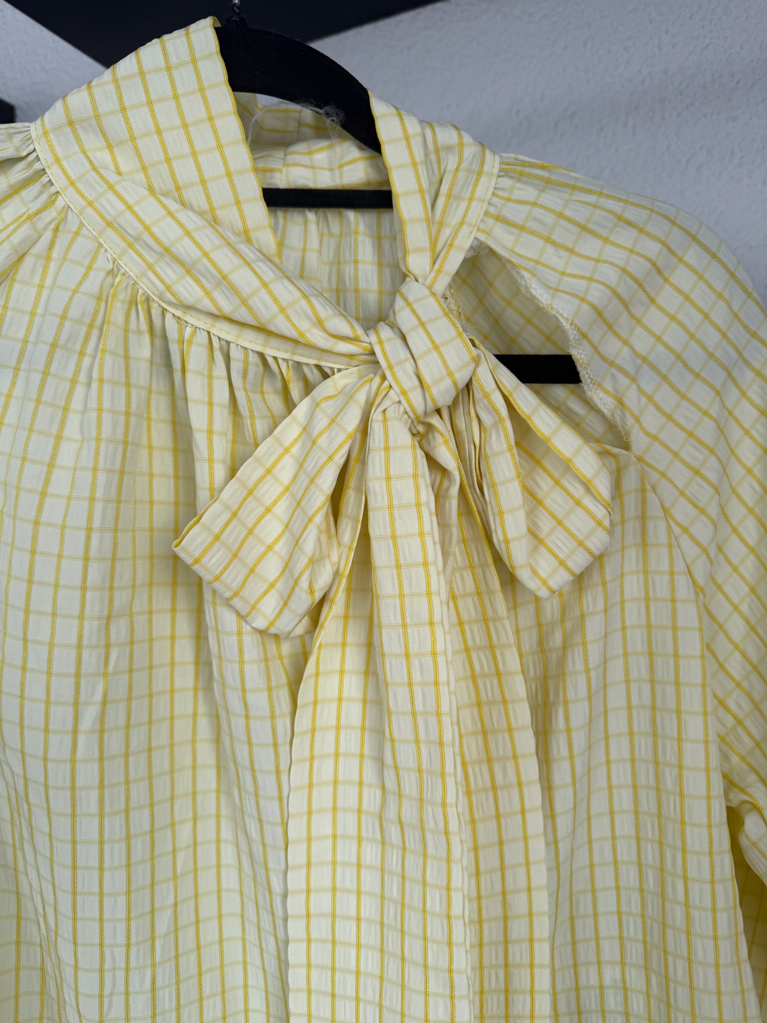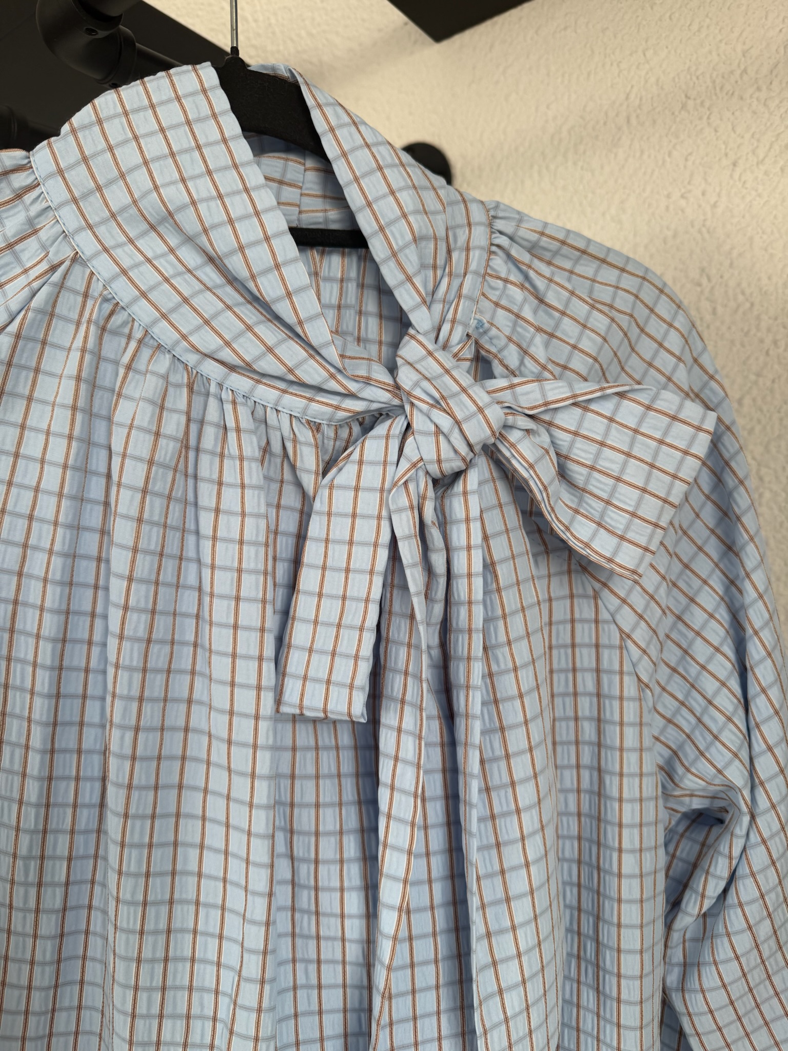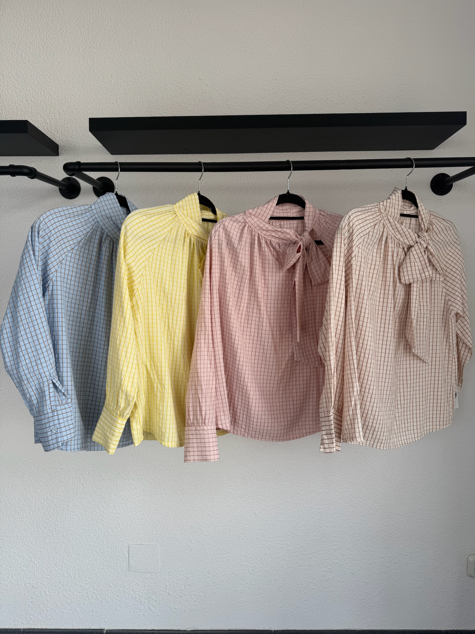 Blusa talla única amplia con estampado de cuadros al tono y detalle de lazo en el cuello sobre un lado. Disponible en cuatro colores.
