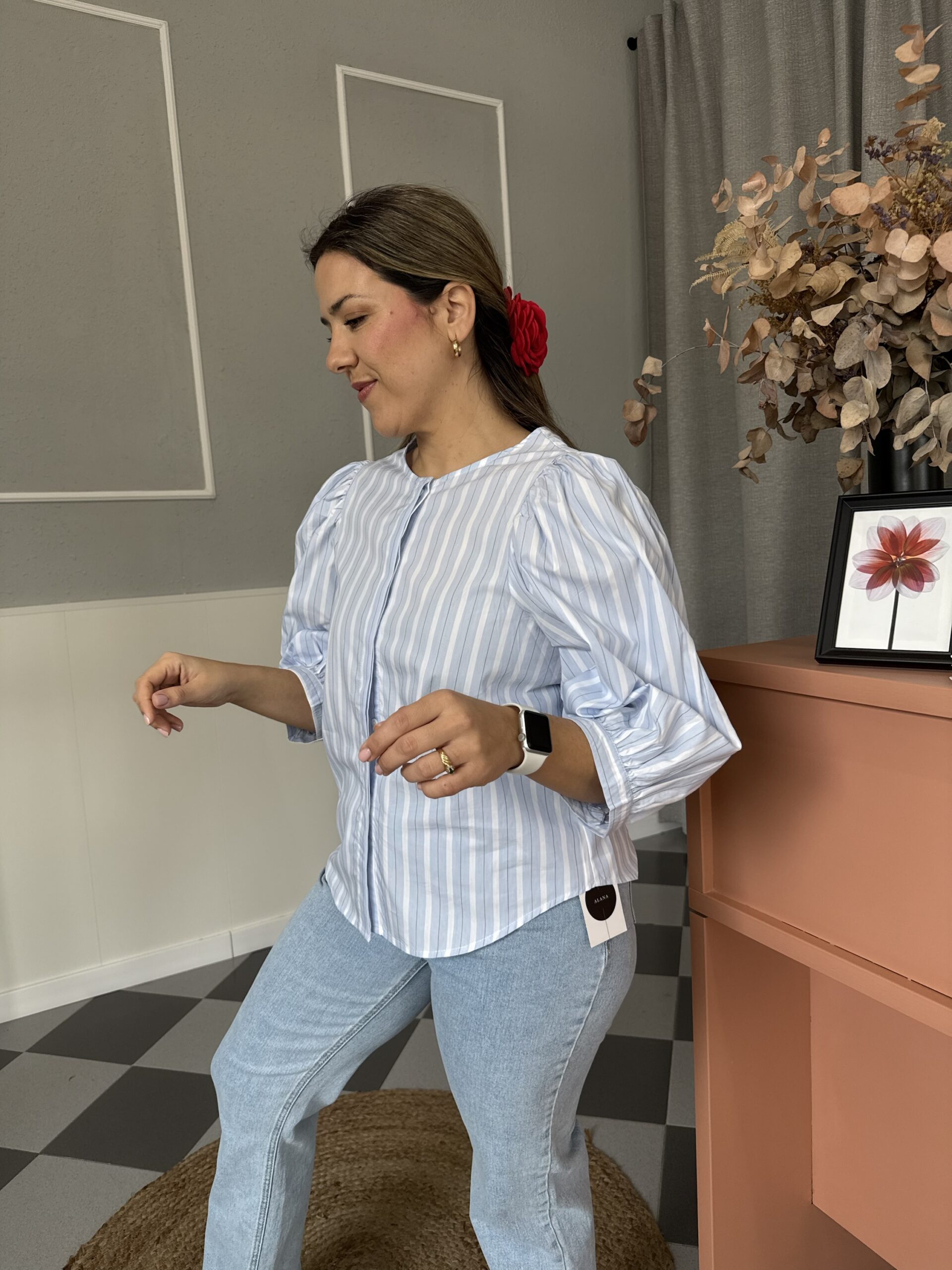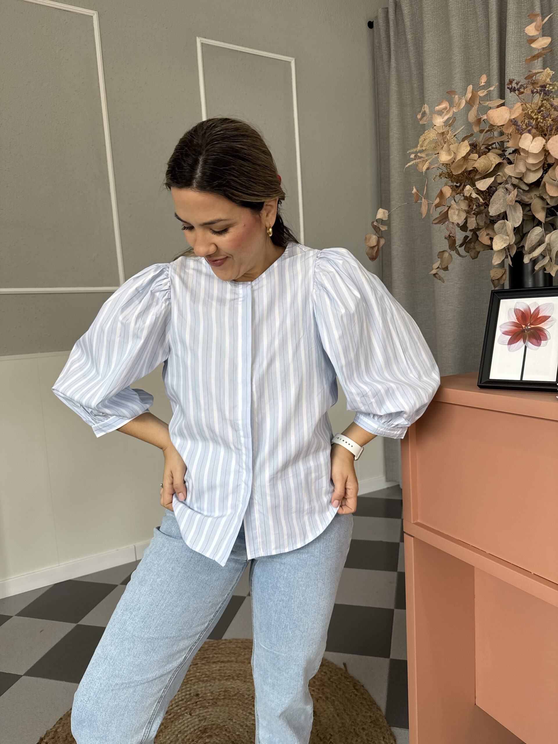 Camisa abotonada de rayas con cuello mal y mangas al codo abullonadas.