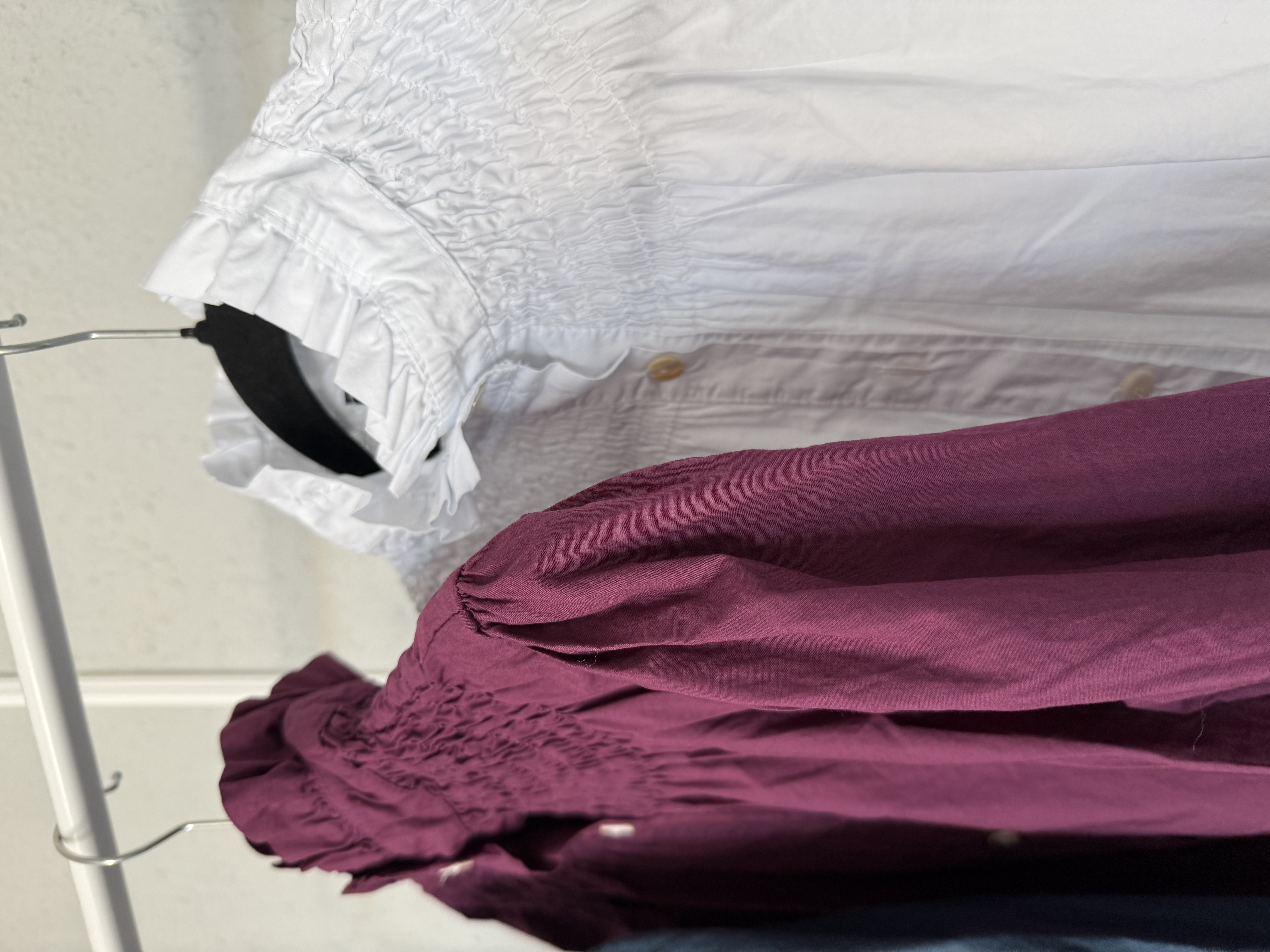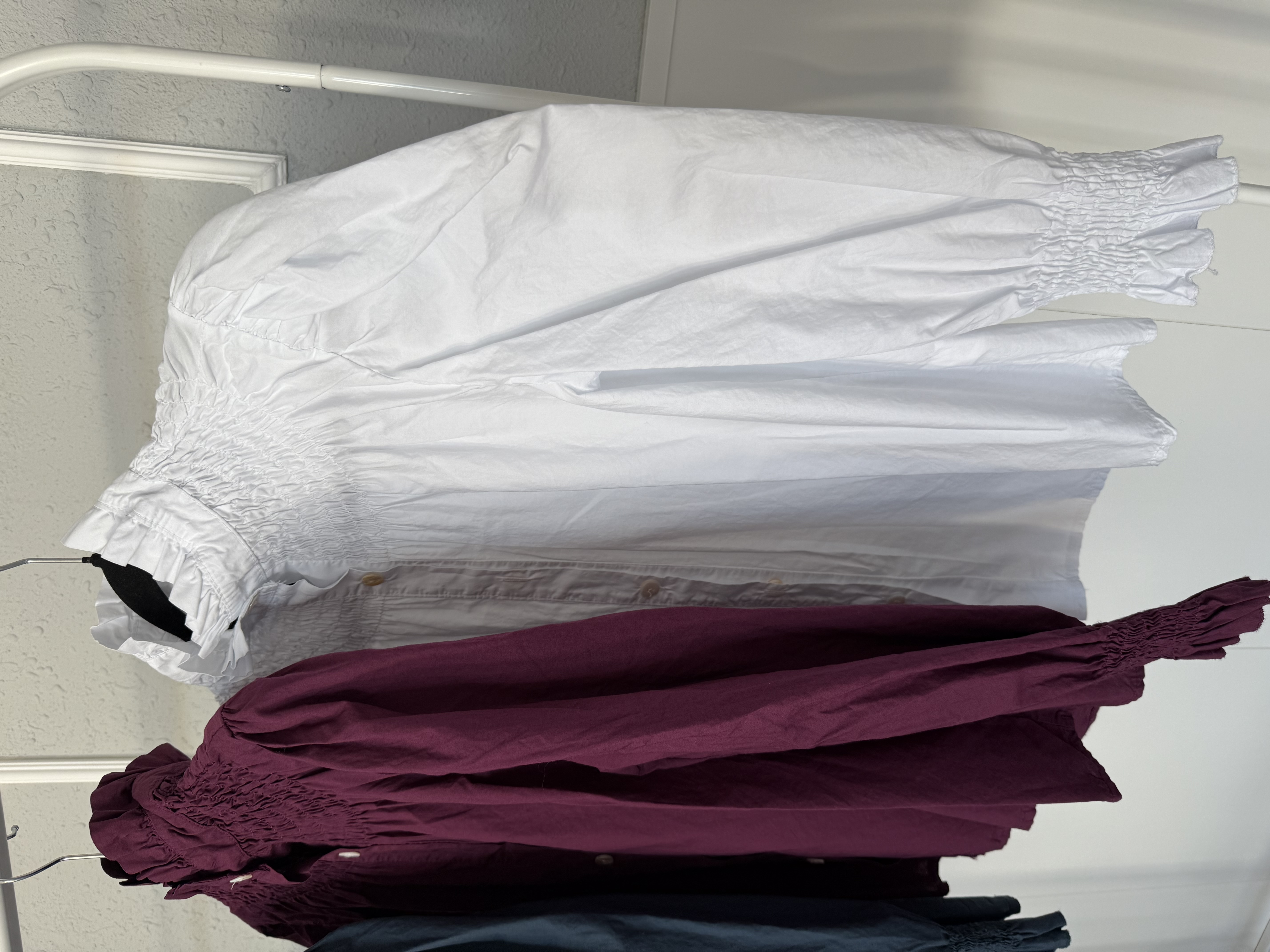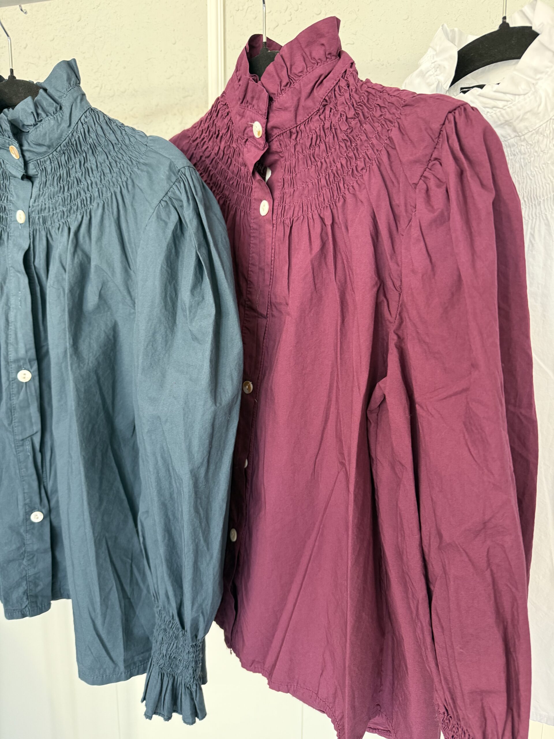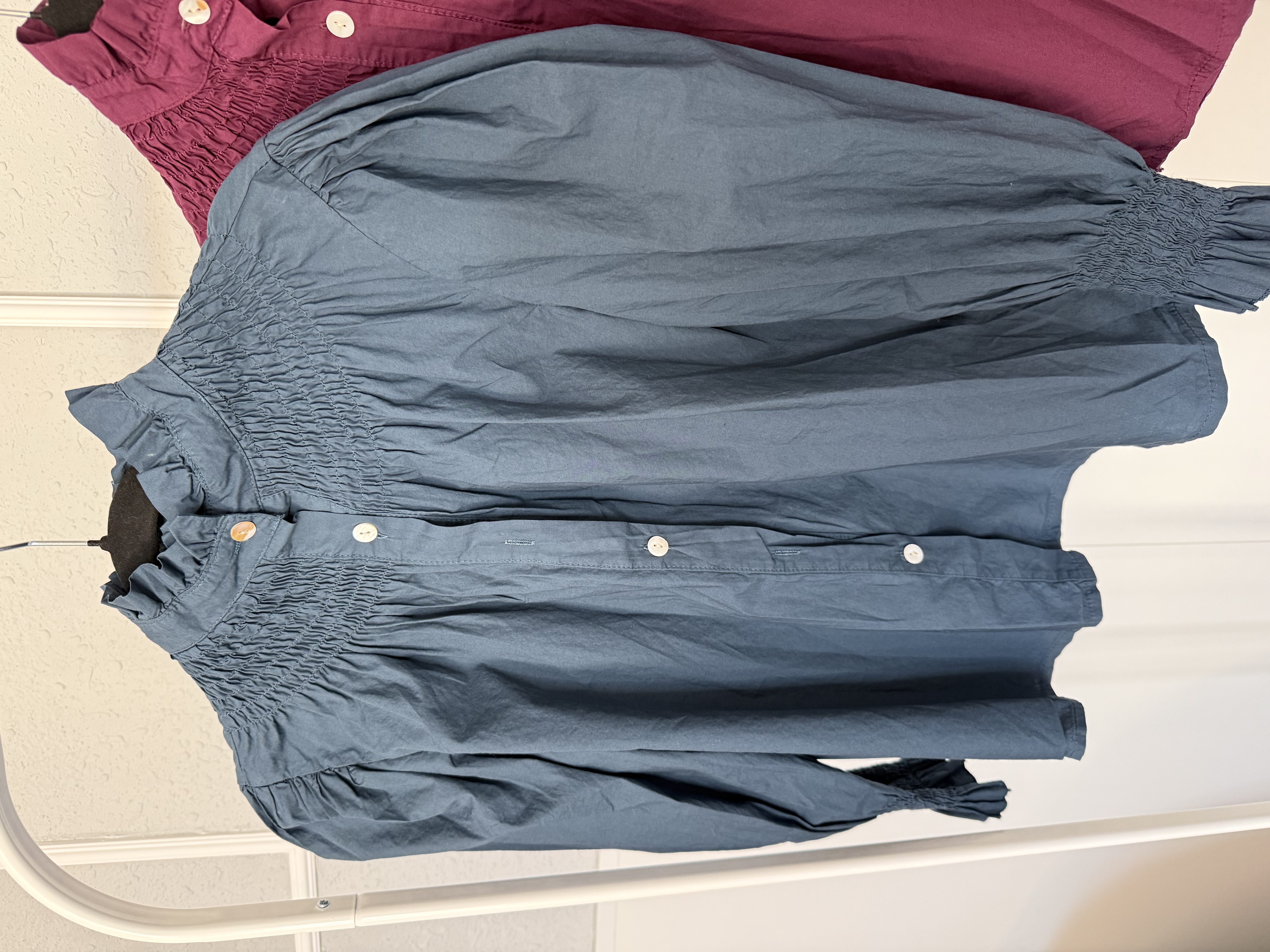 Camisas de algodón y media manga con cuello subido y detalle del fruncido en el pecho. El hombro es subidito y queda efecto hombrera muy bonito.