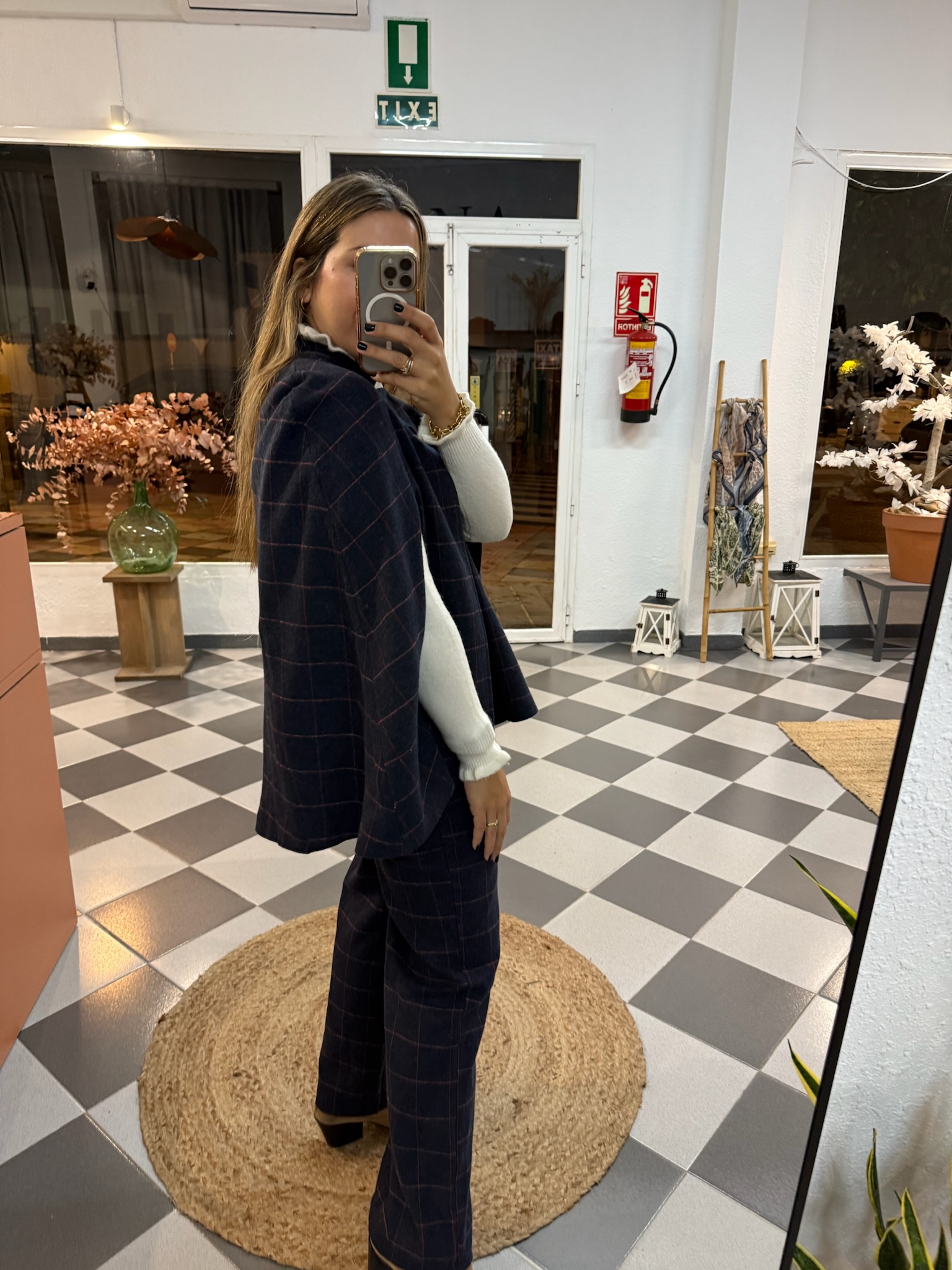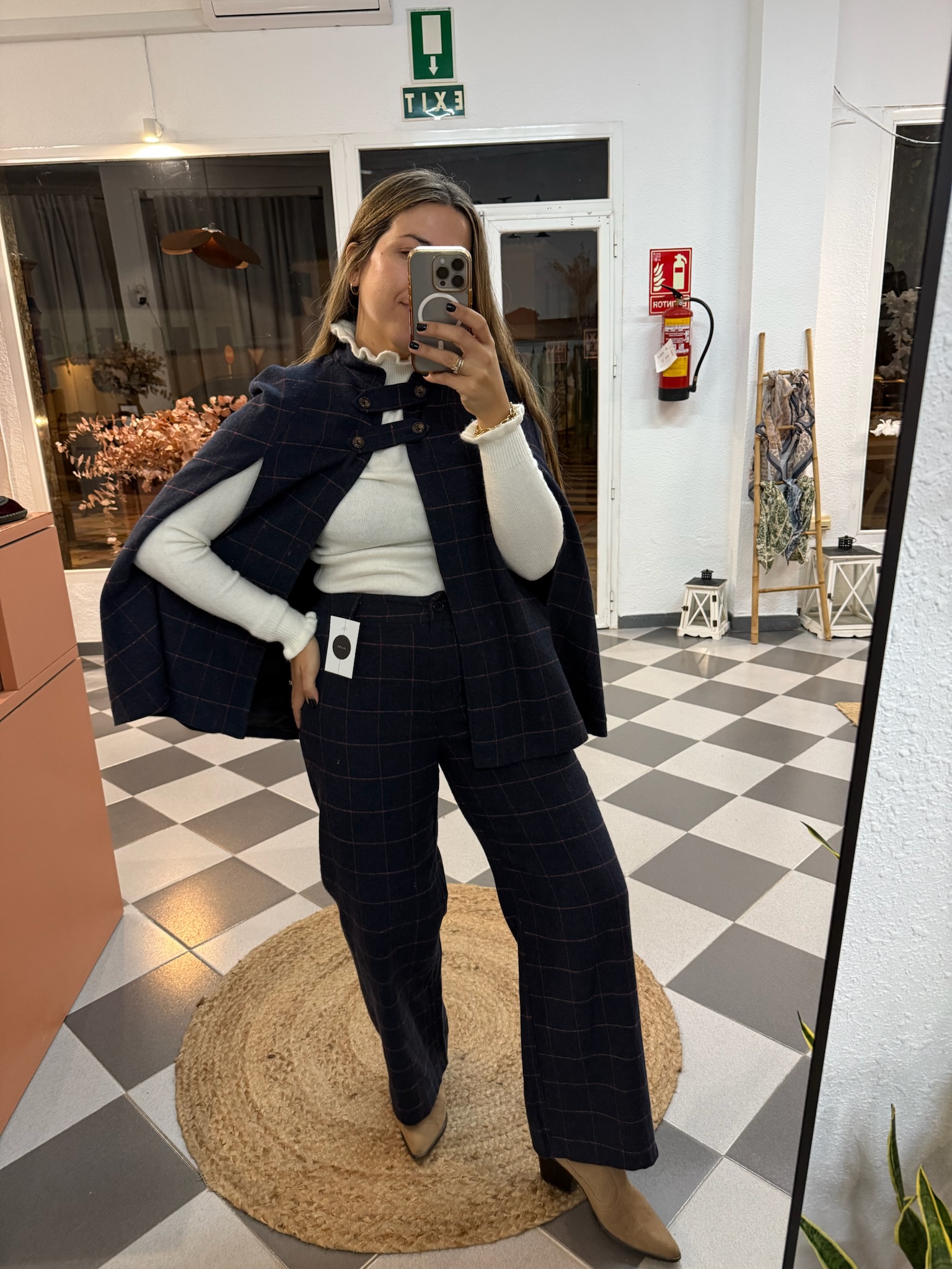 Capa de cuadros con botones en el pecho y aberturas en los brazos para poder sacarlos. En tejido de paño, perfecta para invierno.
