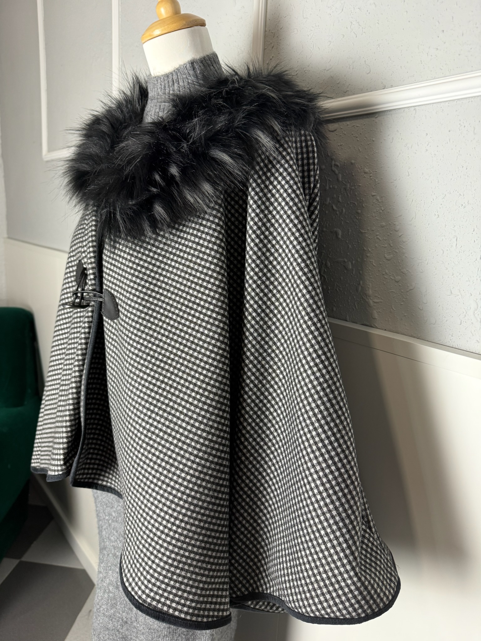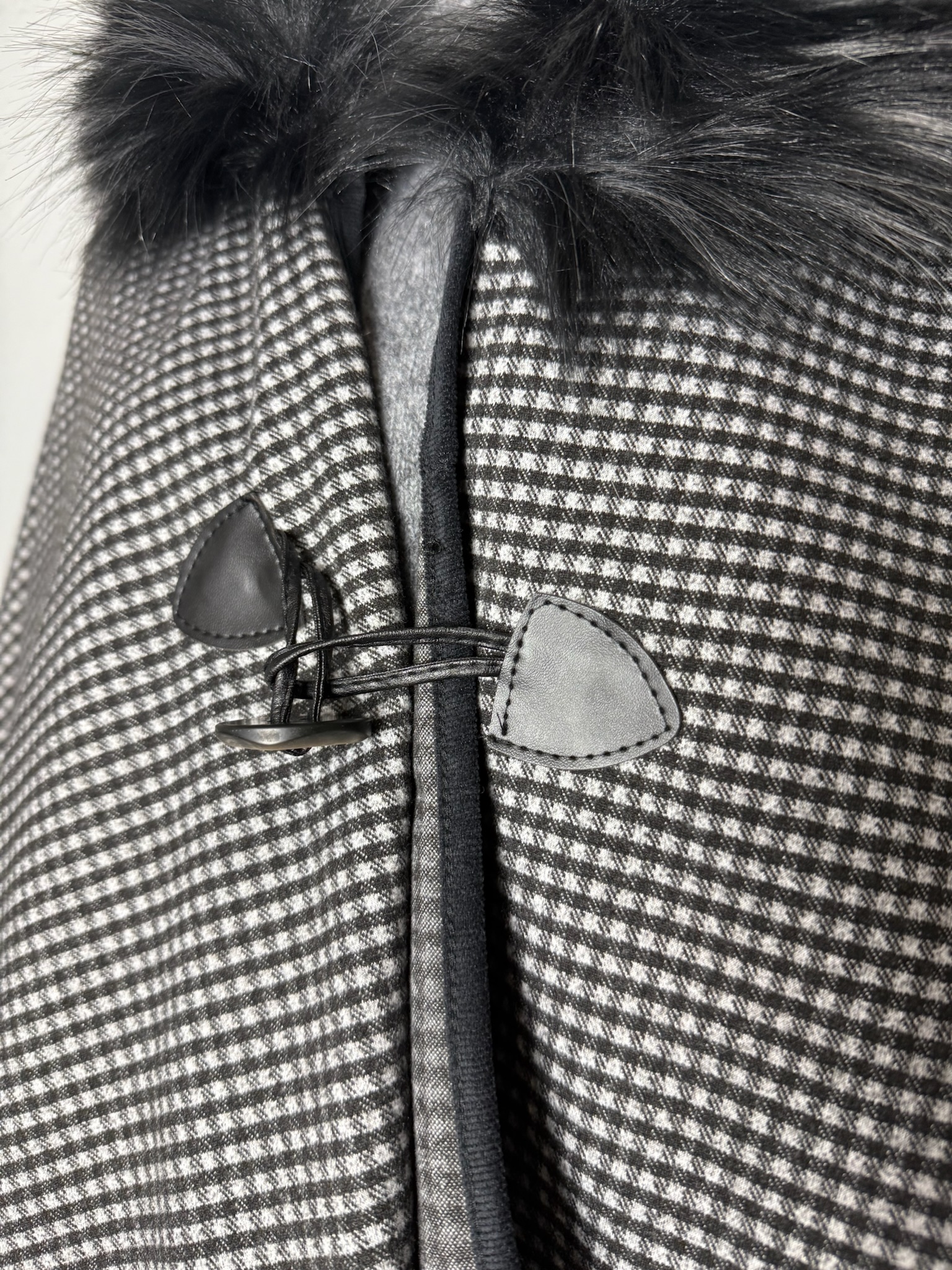 Ideal abrigo con estampado de pata de gallo en tonos negros con cuello de pelo y cierre de un botón.
