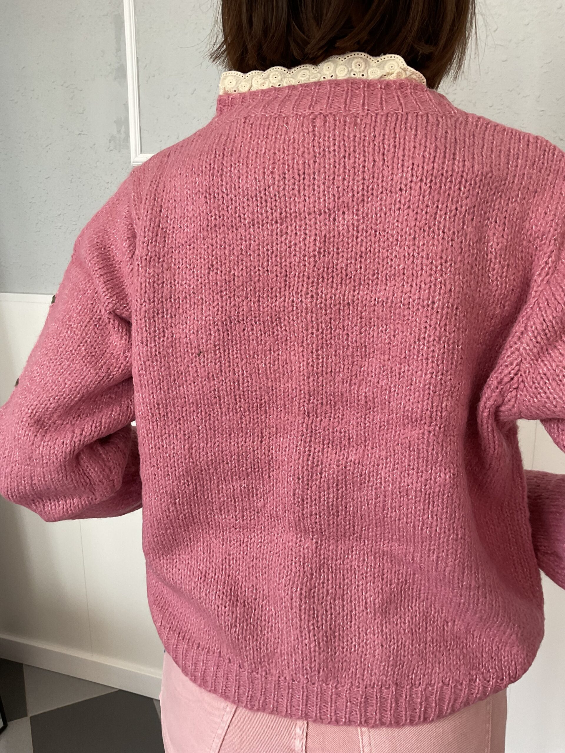 Preciosa cárdigan en tono rosa con flores bordadas y cuello de encaje. Se pude hacer reserva. Talla única.