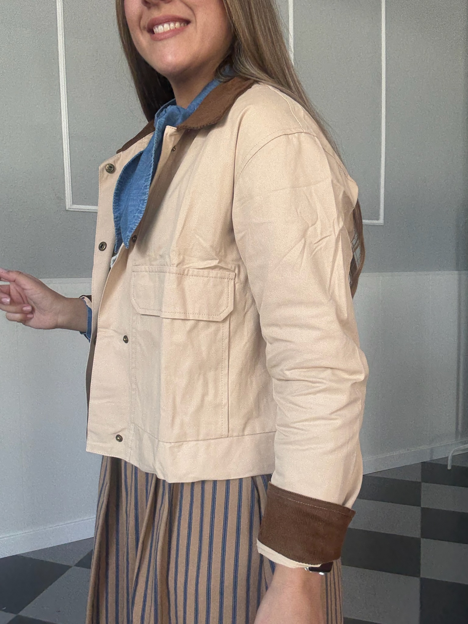 Con bolsillos delanteros y contraste de cuello y puños en pana marrón chocolate.