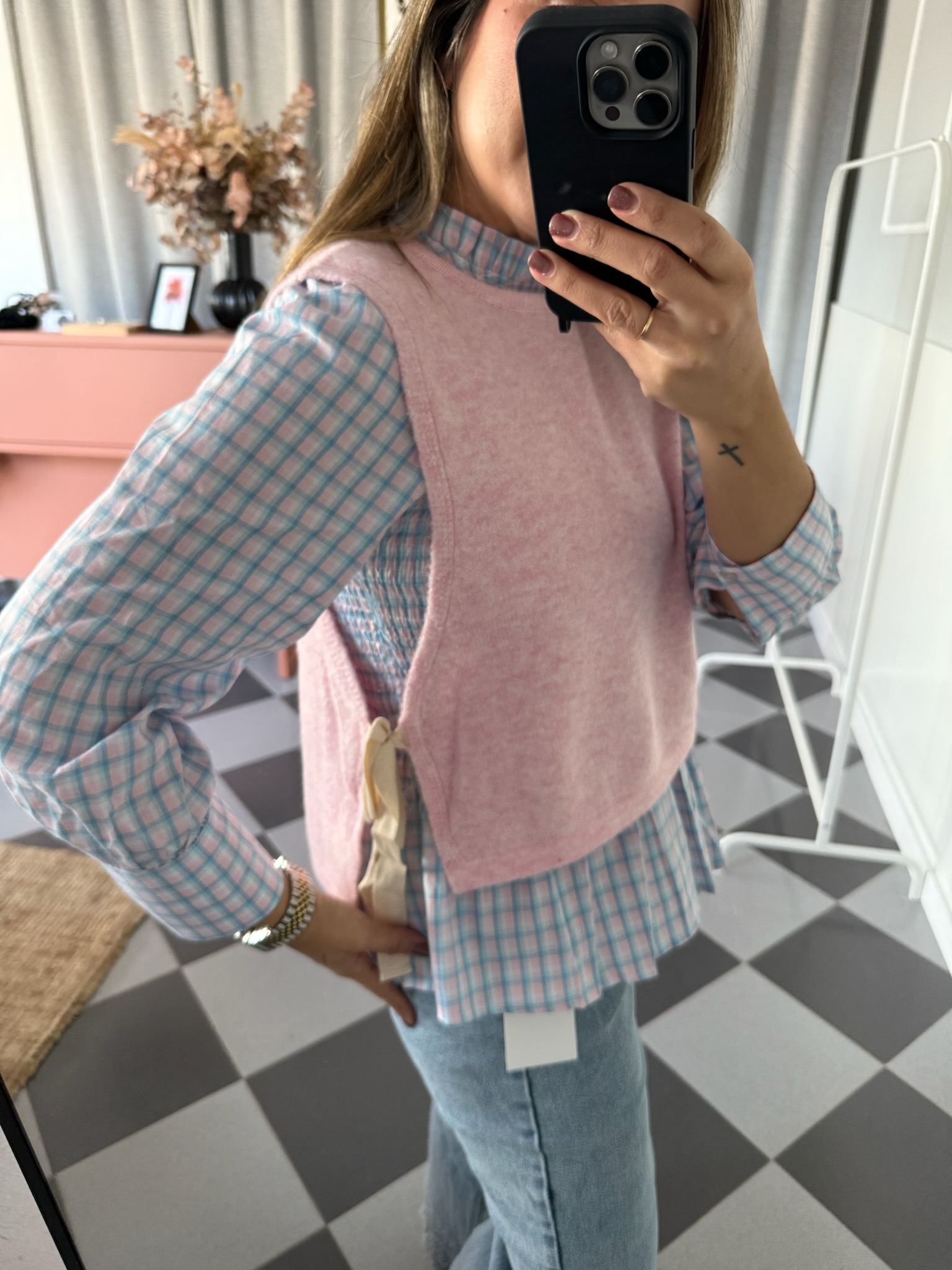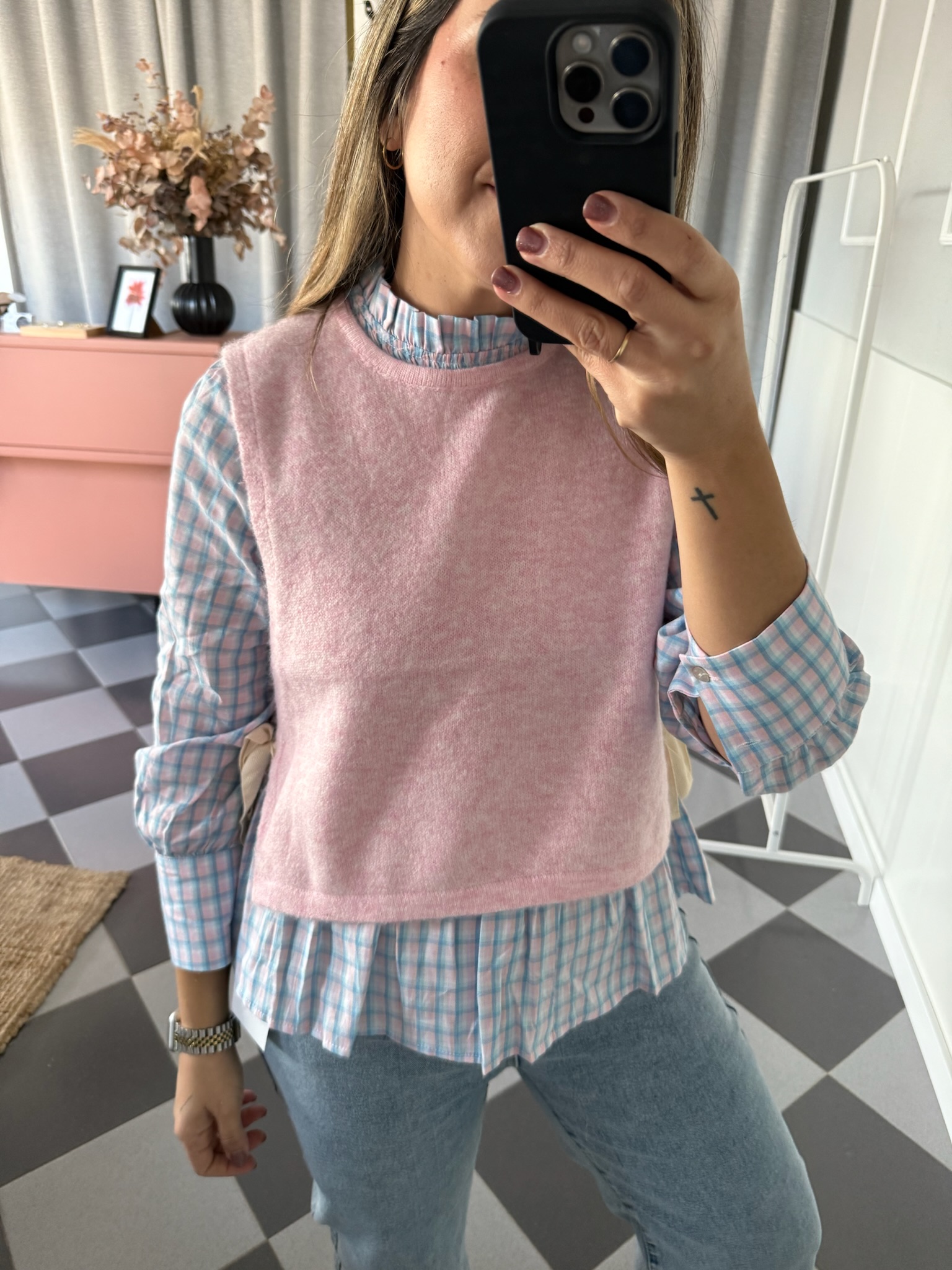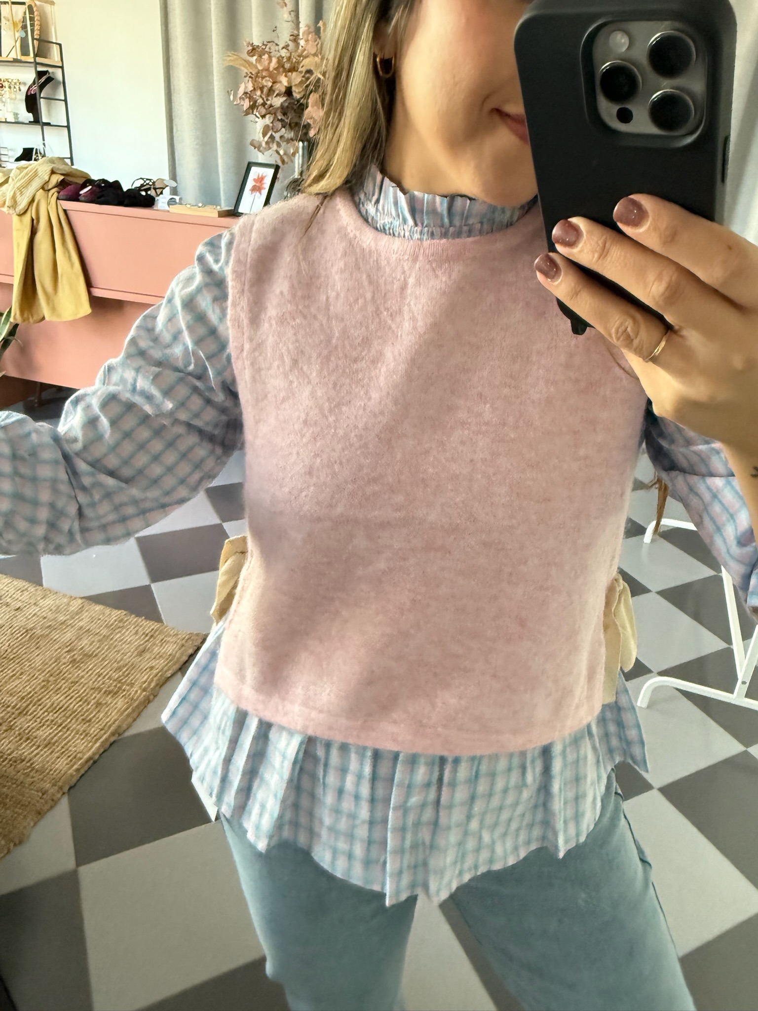 Chaleco en color rosa pastel con detalles de lazos en ambos lados.