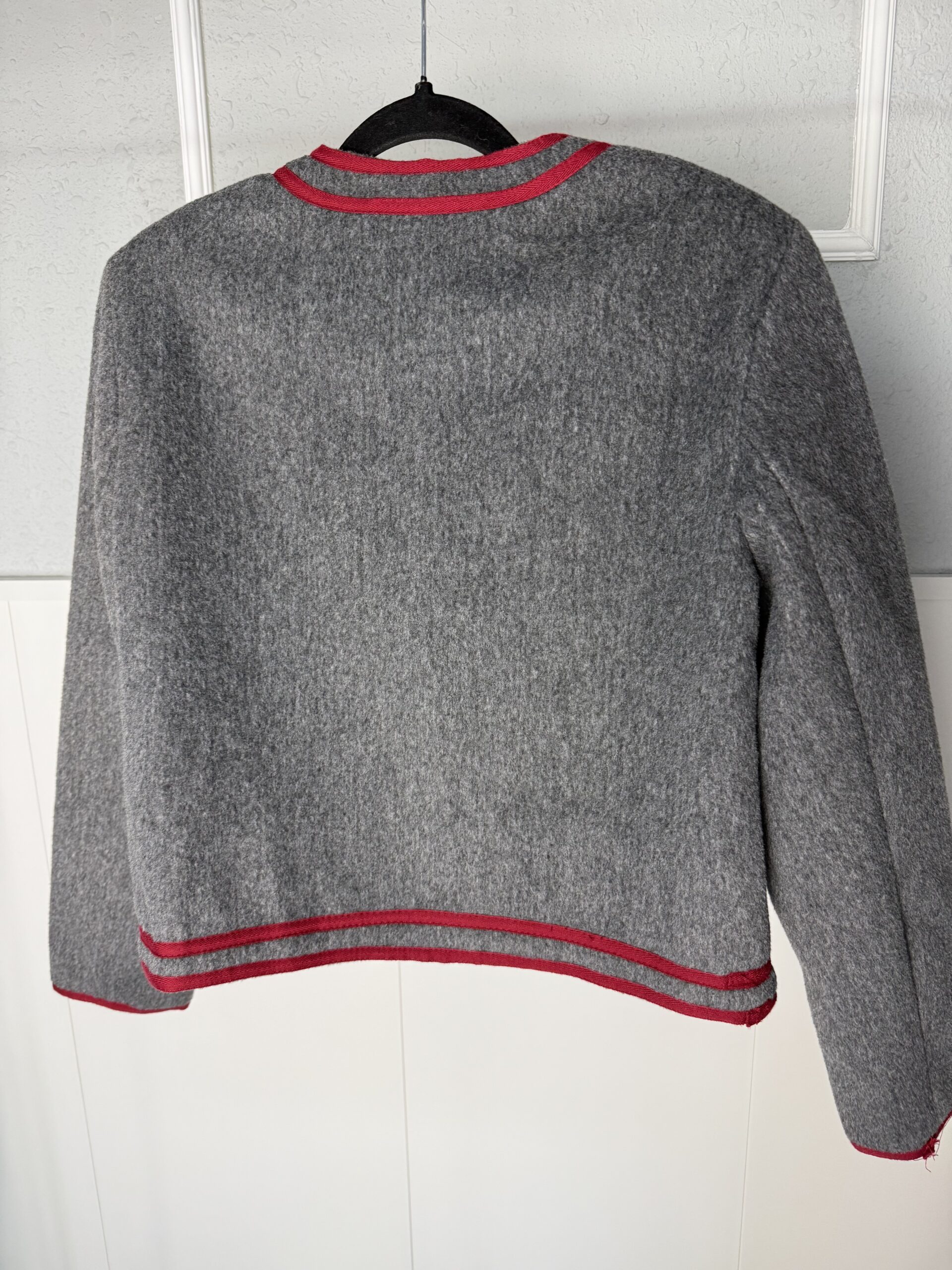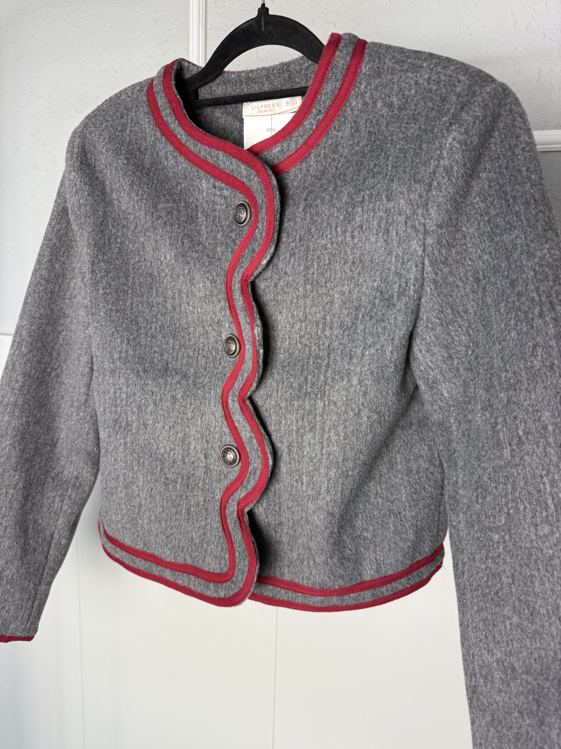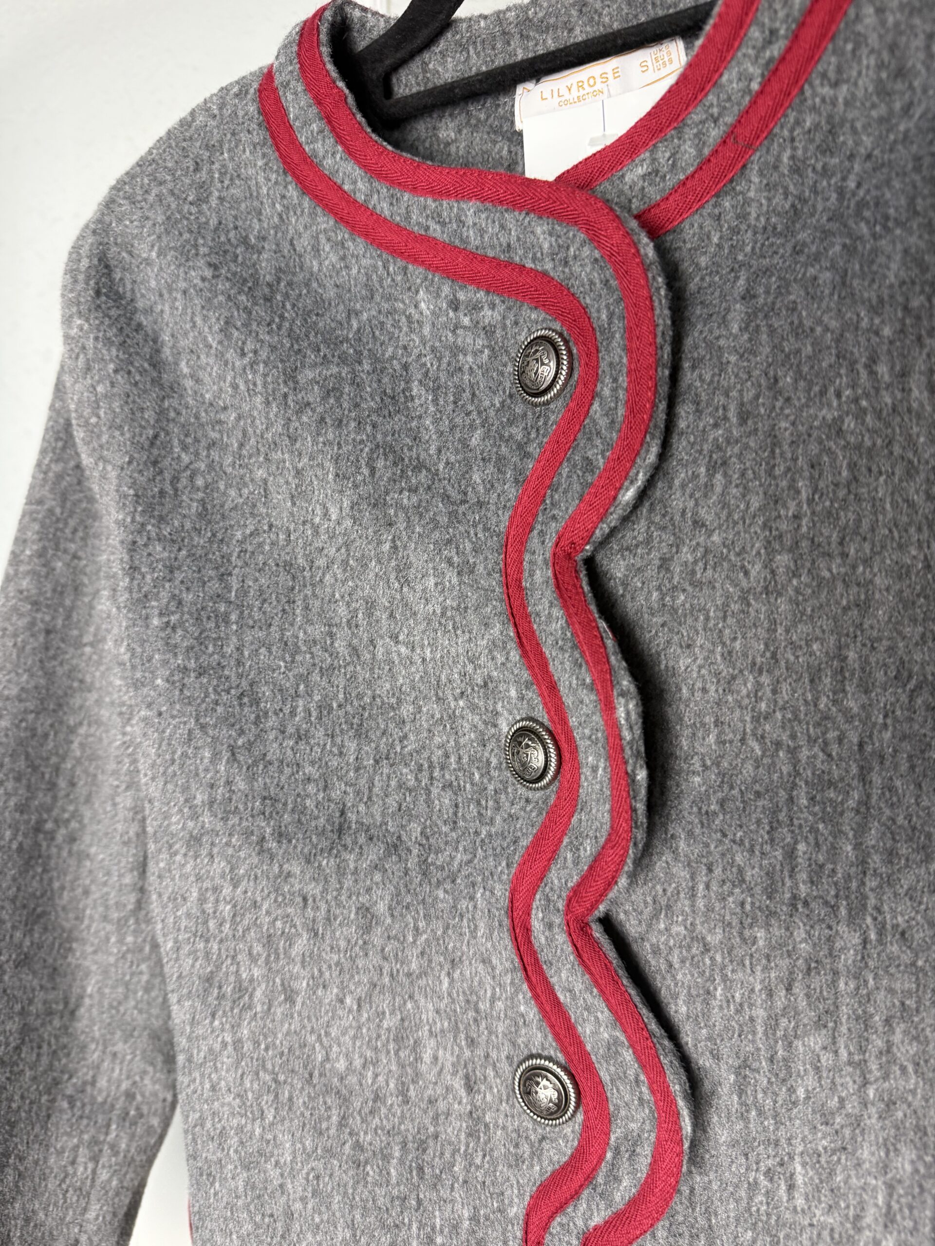 Chaqueta gris cruzada con detalle de cinta granate y botones metálicos.