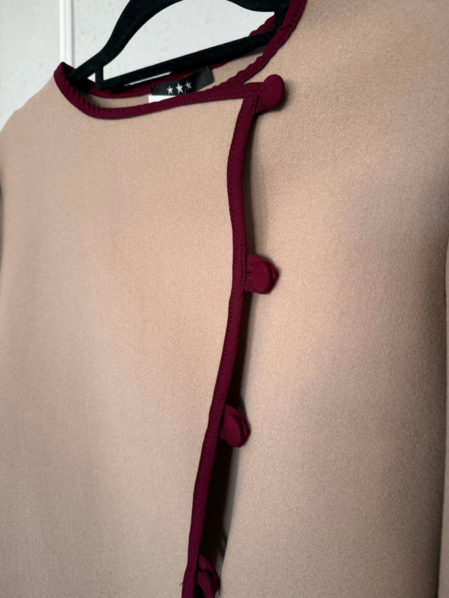 Chaqueta cruzada de paño con manga abullonada. Botones forrados y vivo en el tono Burdeos.