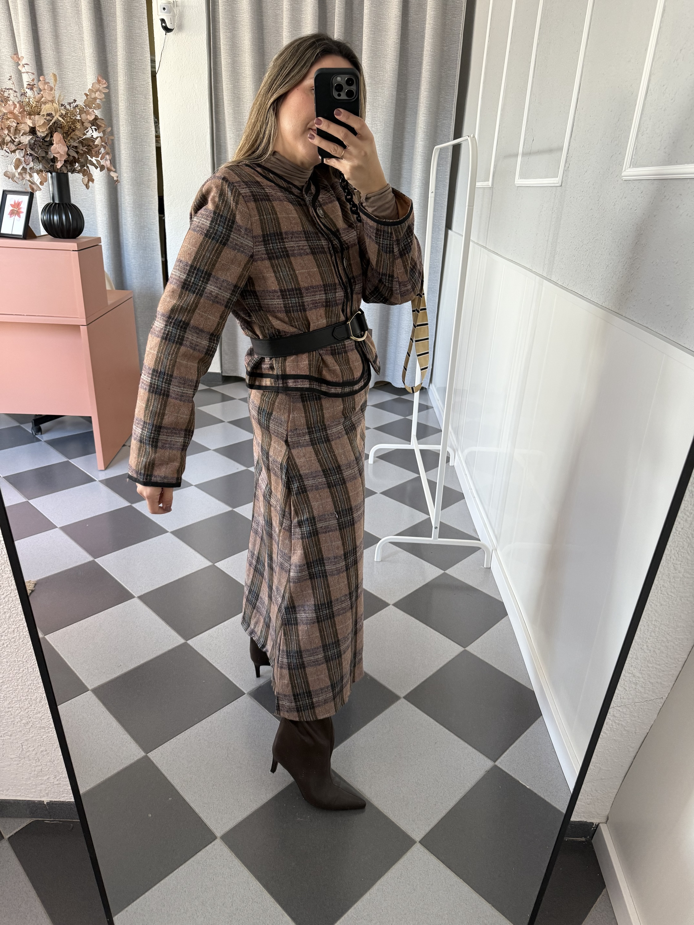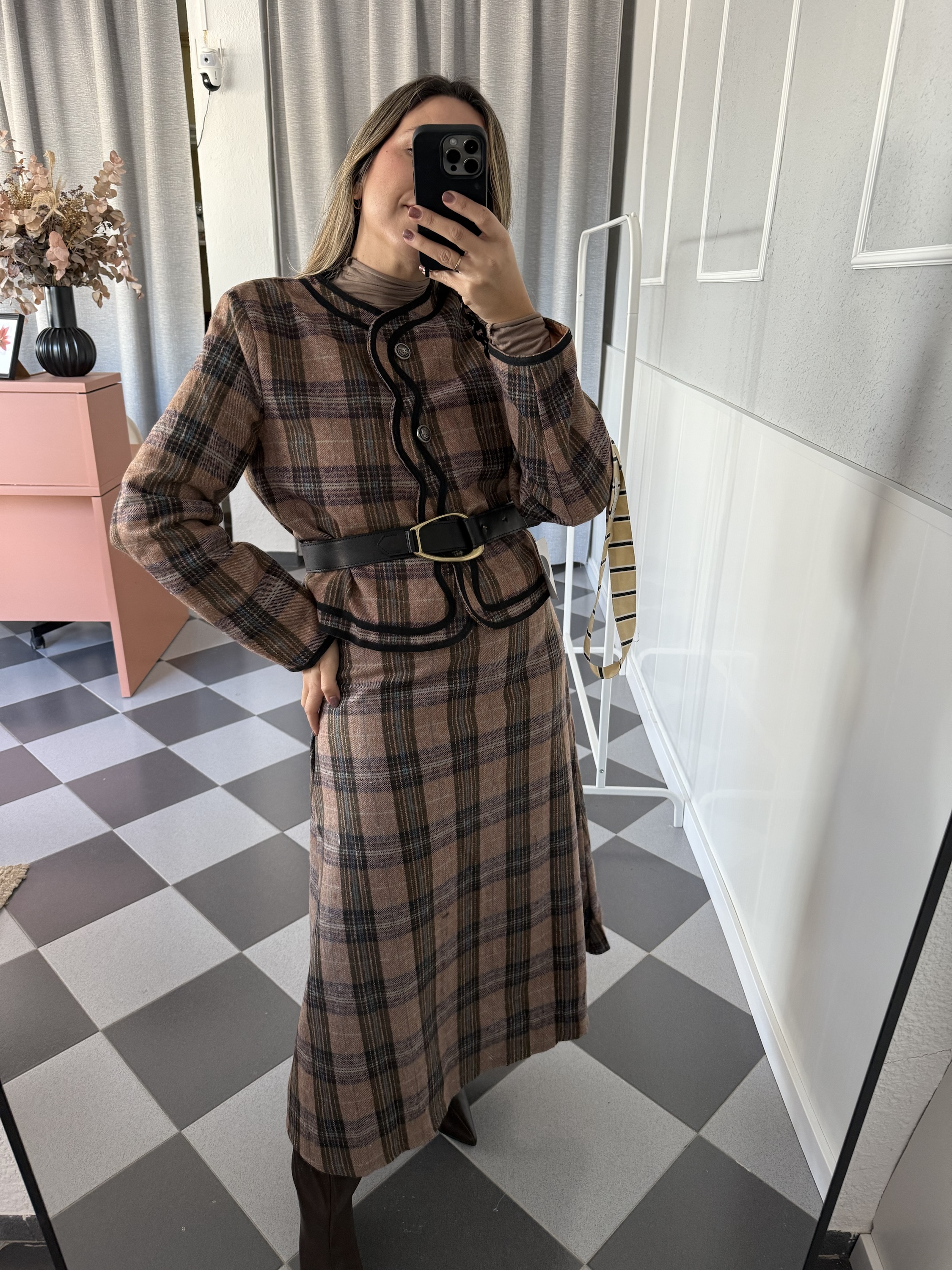 Chaqueta cruzada de cuadros con detalle de botones metálicos y cinta negra. Ideal para combinar con la falda a juego y crear un total look sofisticado.