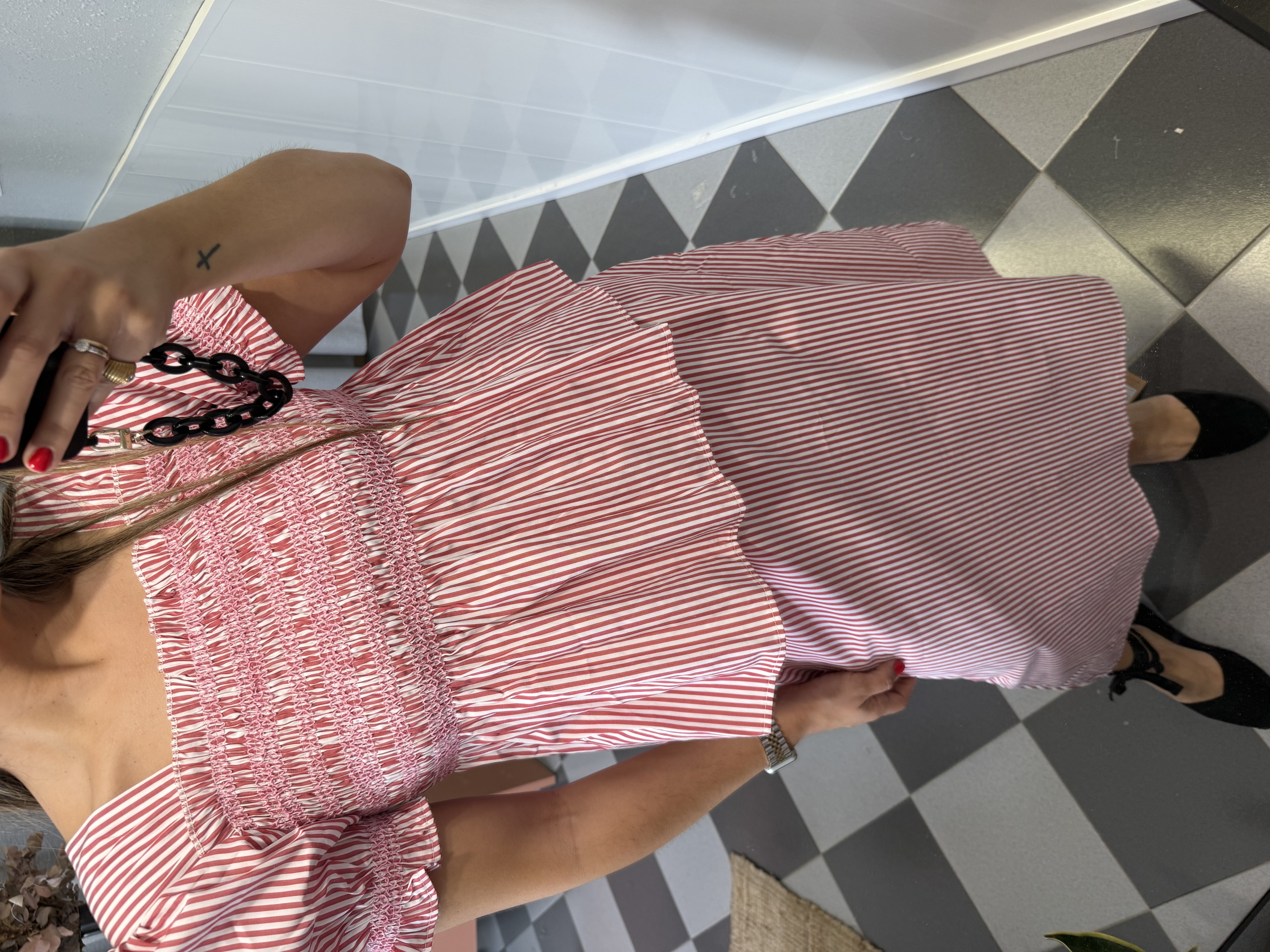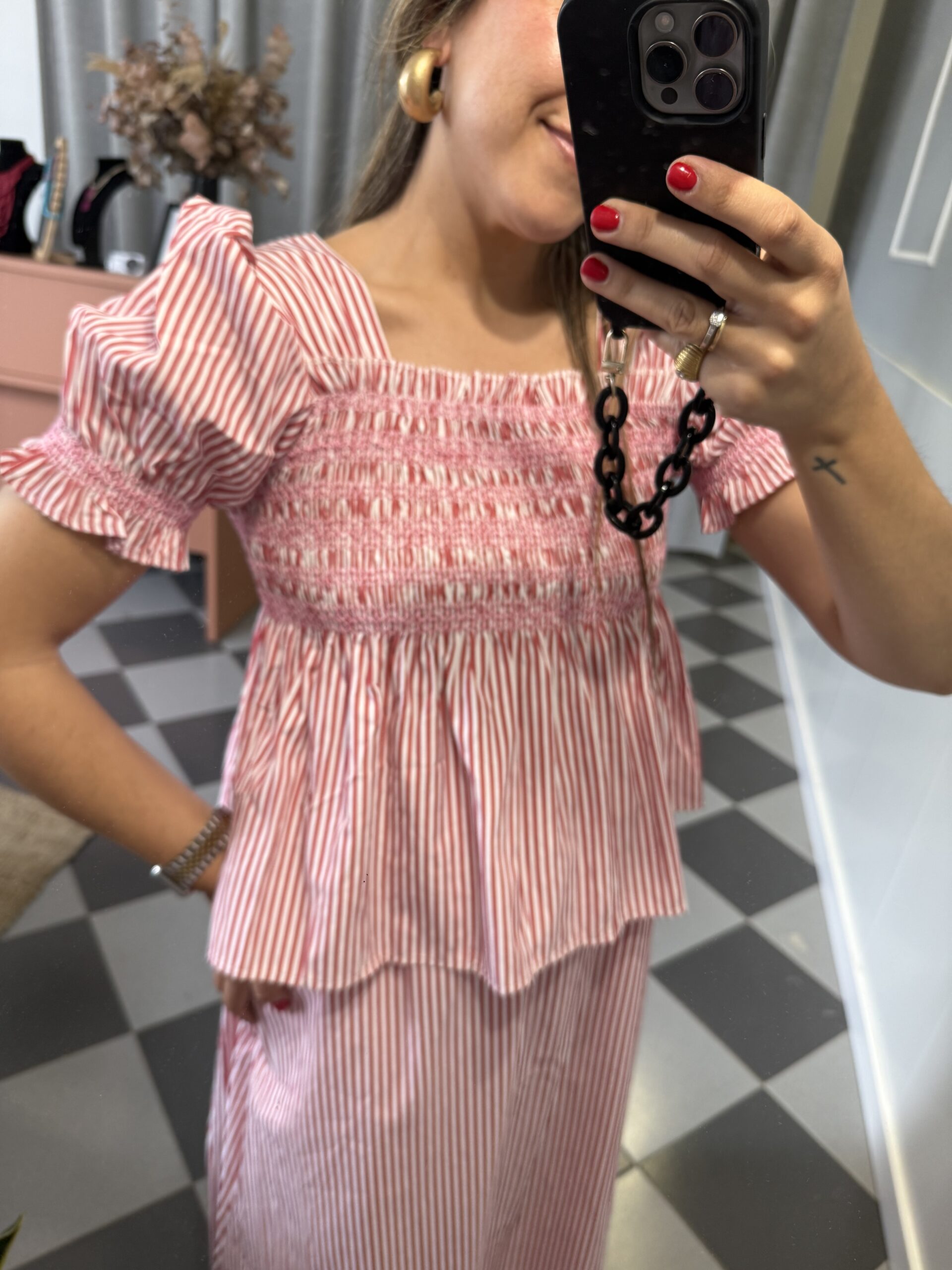 Conjunto de algodón con detalle de nido de abeja en el pecho y falda con cintura engomada.