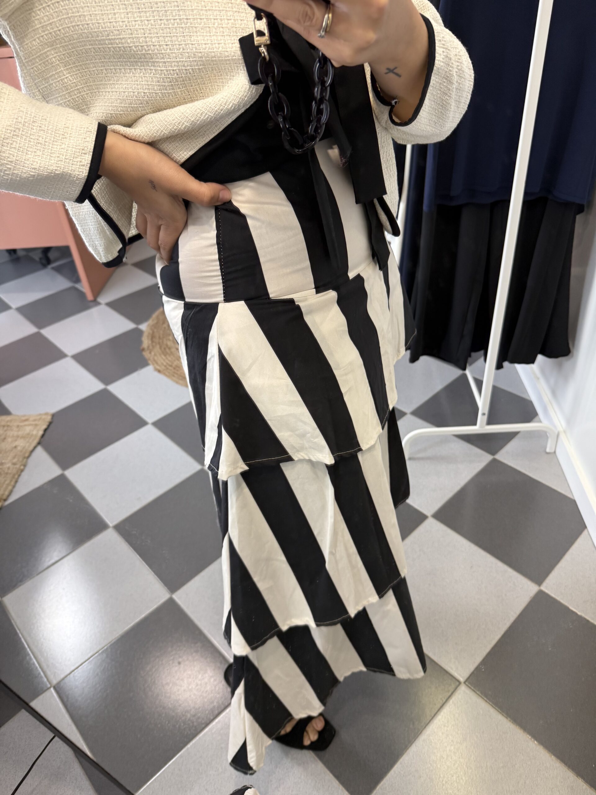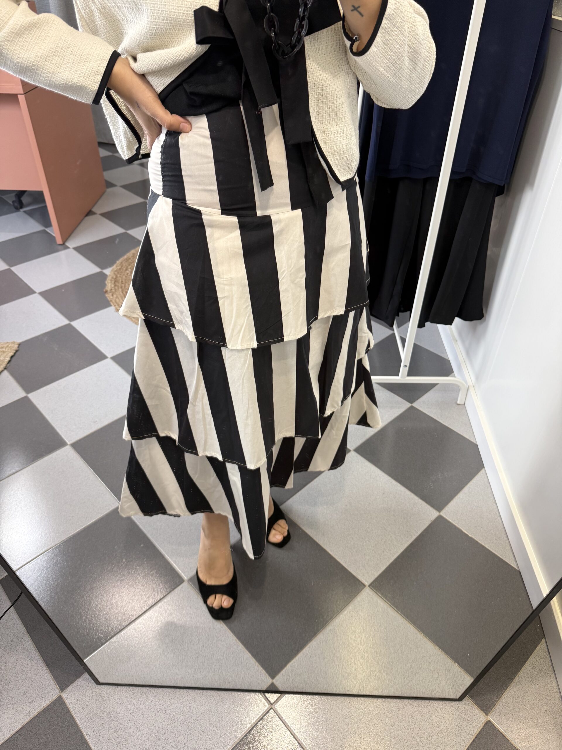 Falda de algodón en talla única con estampado de rayas blancas y negras y con tres volantes grandes.