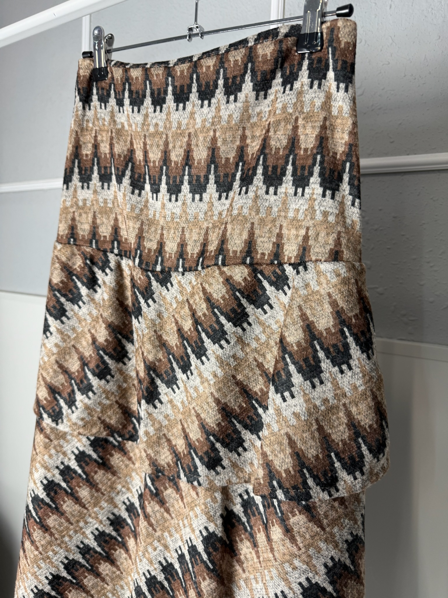 Falda con tejido de paño elástico y detalle de tres volantes grandes. Cintura engomada que queda ajustada y se adapta al cuerpo gracias a su tejido.