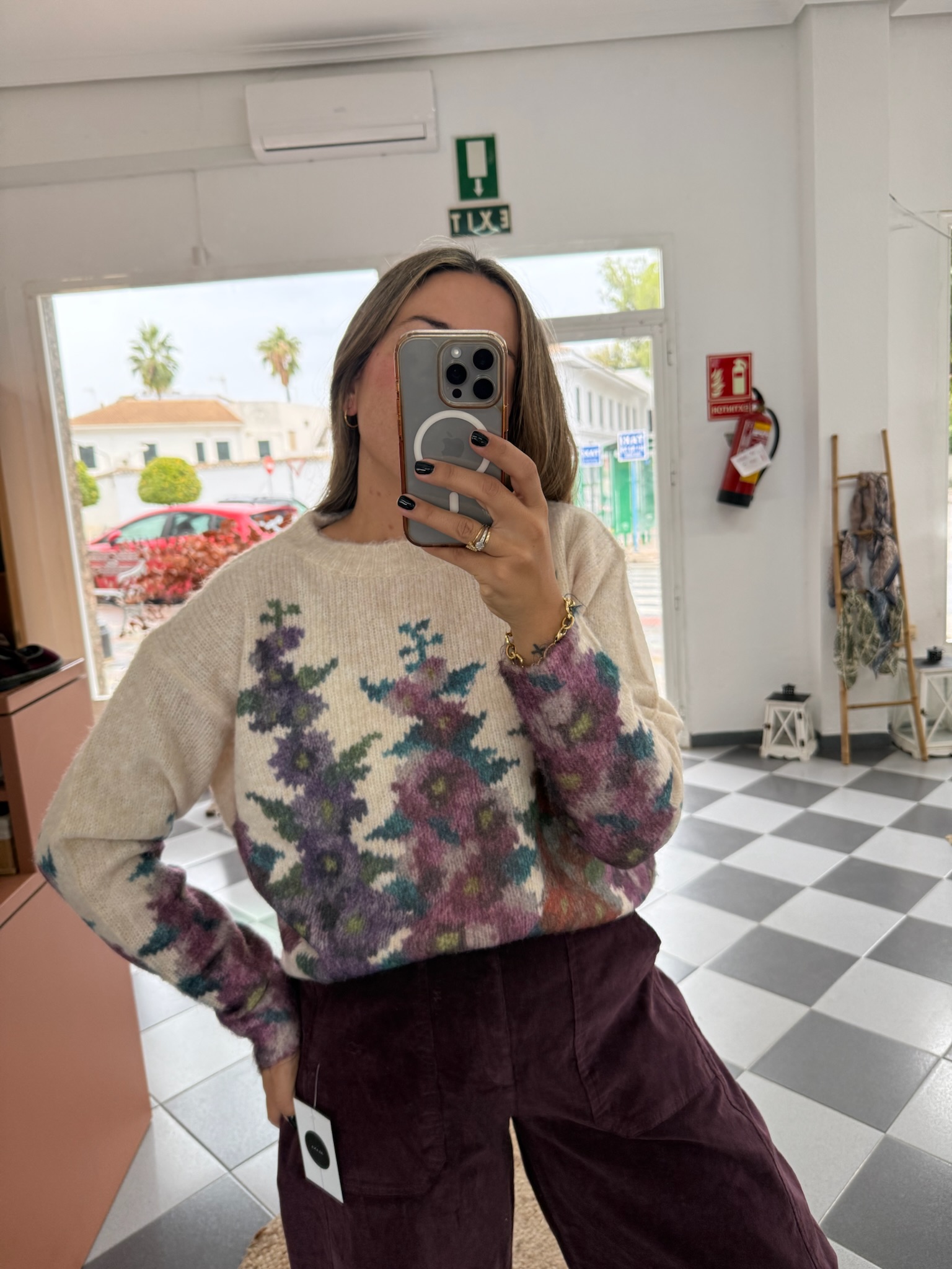 Jersey con mezcla de lana, muy gustoso, talla única, con detalle de flores en el bajo. Ideal para combinar con tonos burdeos tan de moda esta temporada.