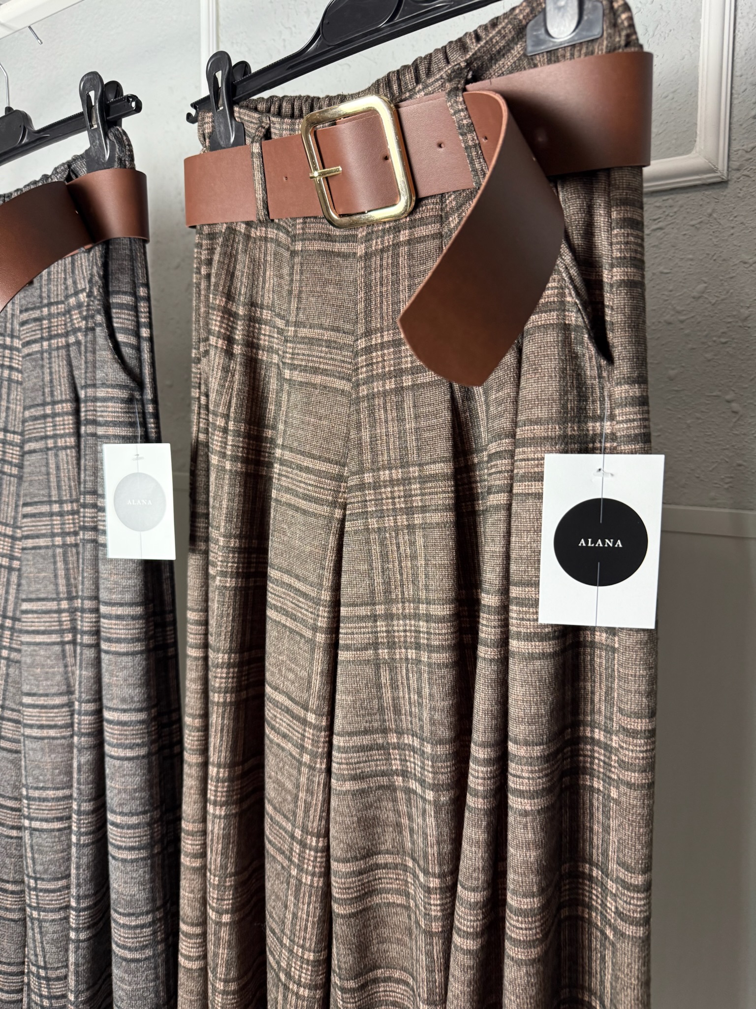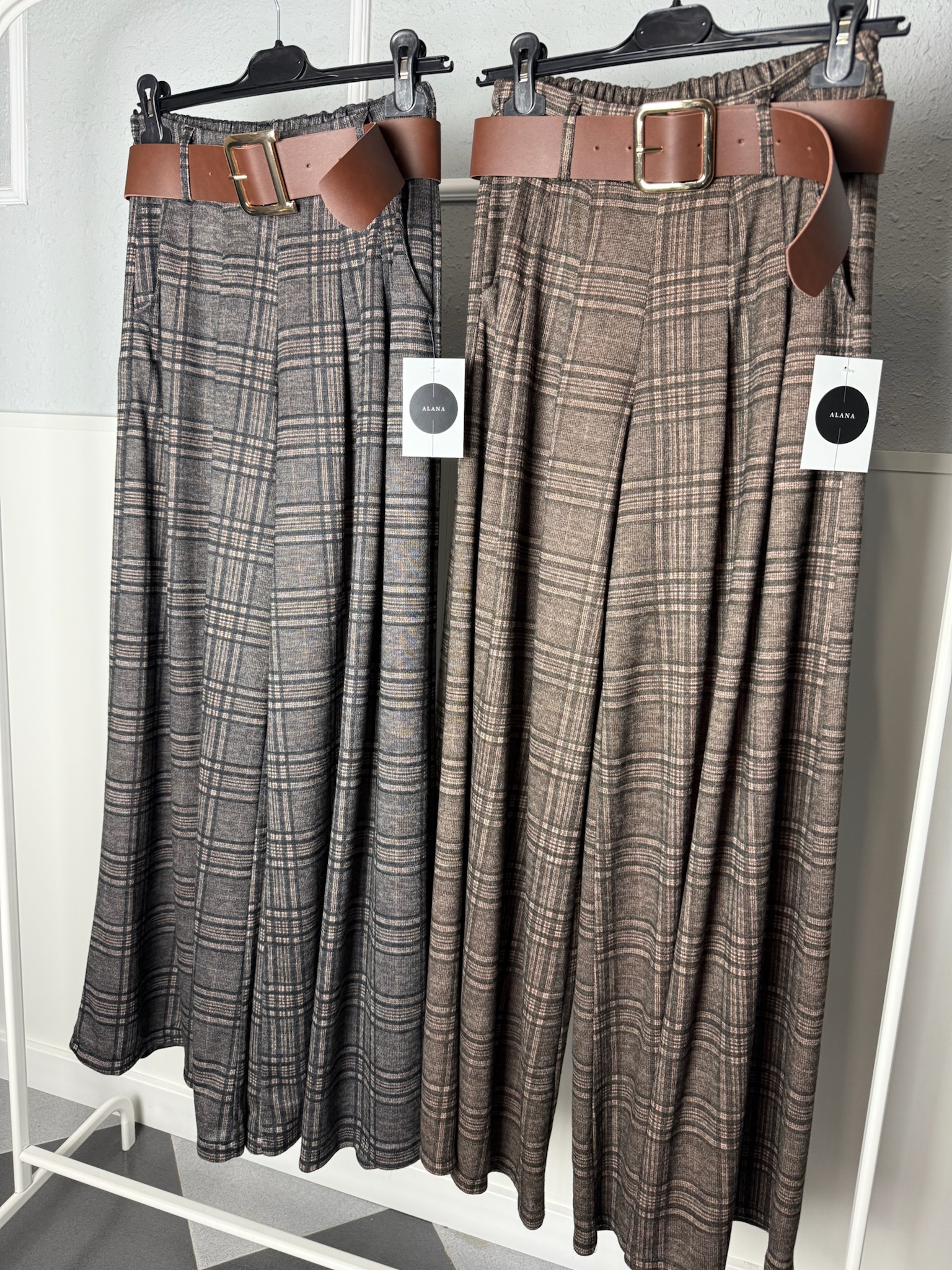 Pantalón ancho con tela muy caída, super cómodos. Con pinzas y cinturón. Disponible en cuadros en tonos marrones o negros.