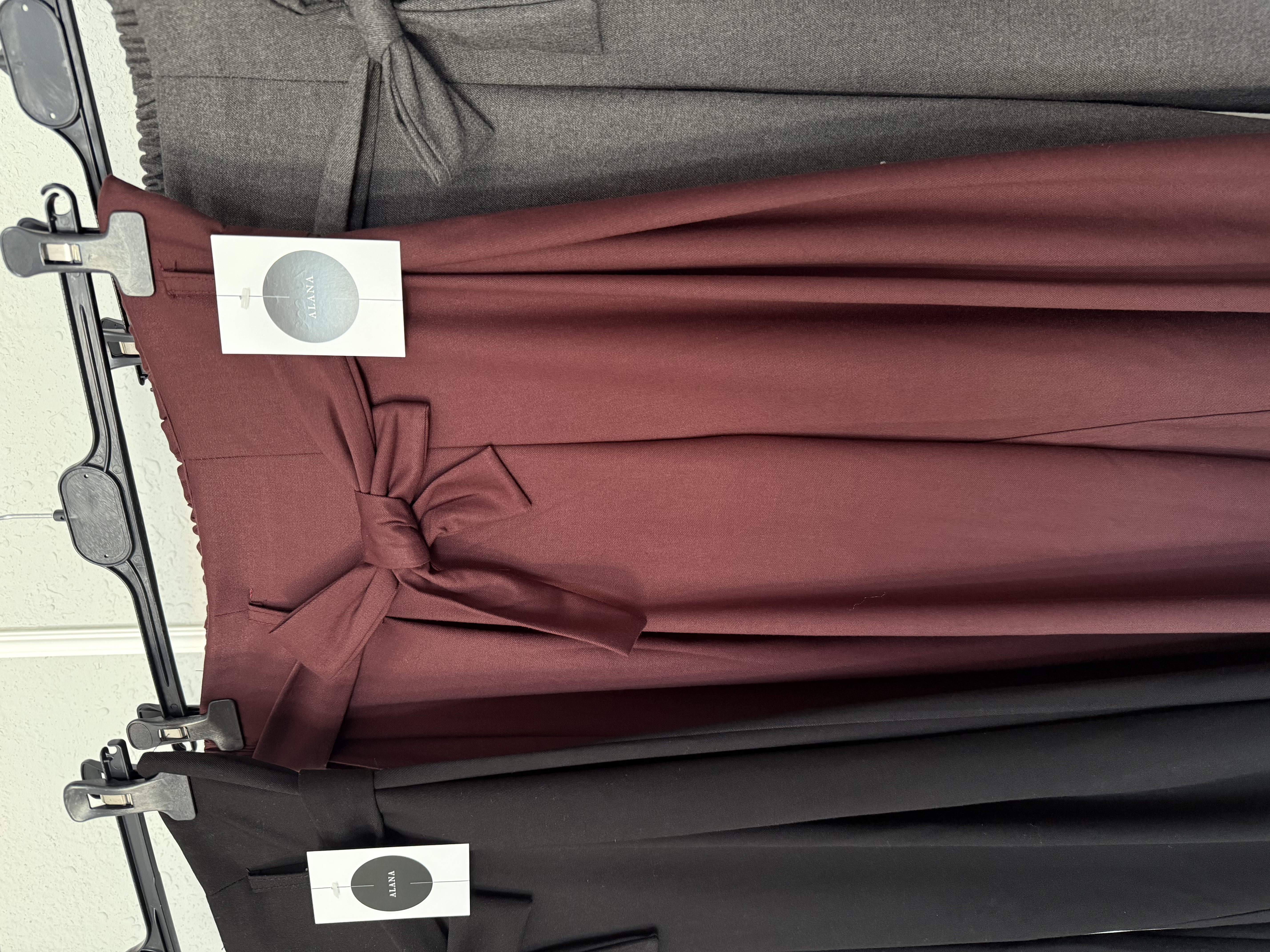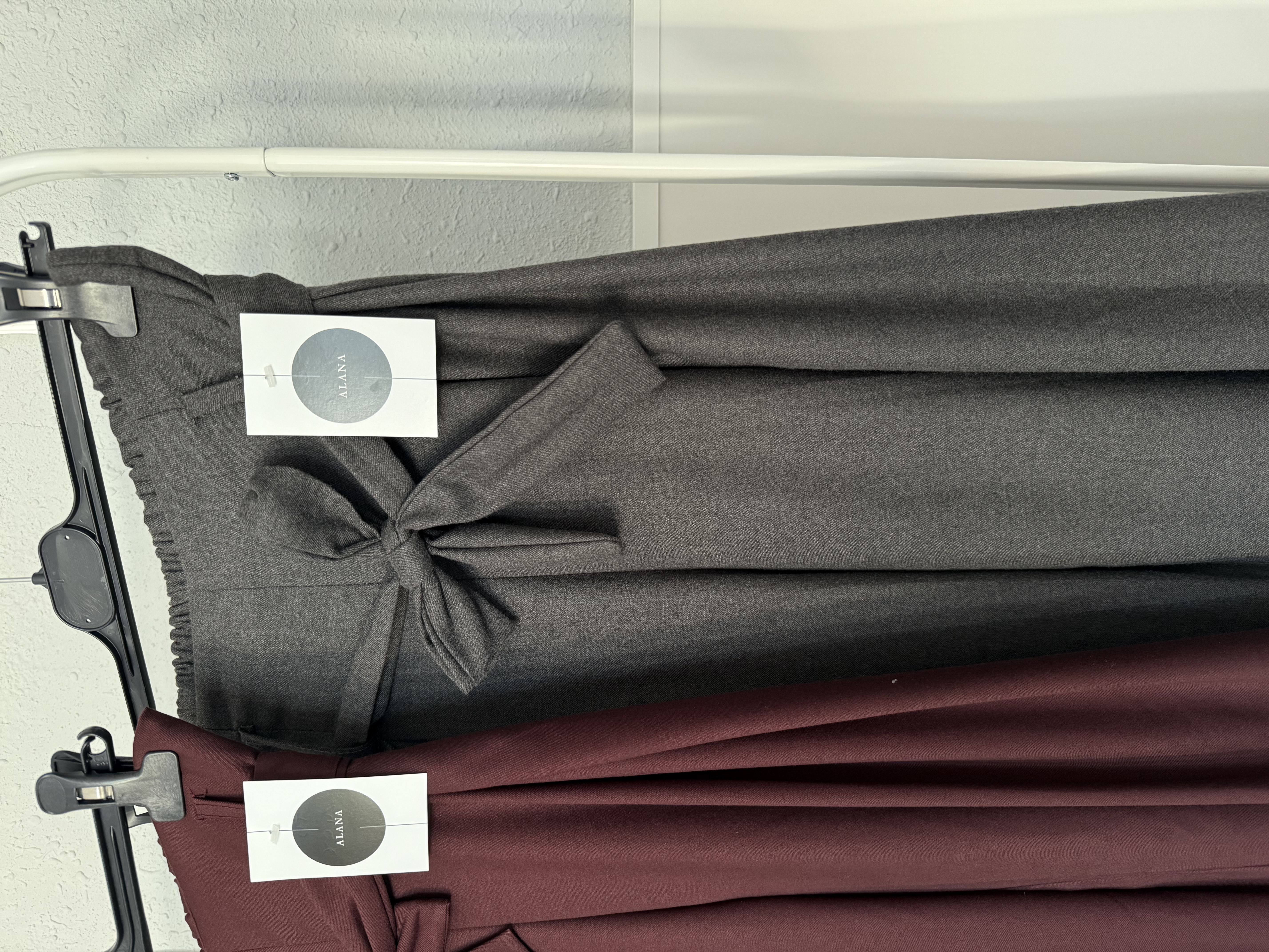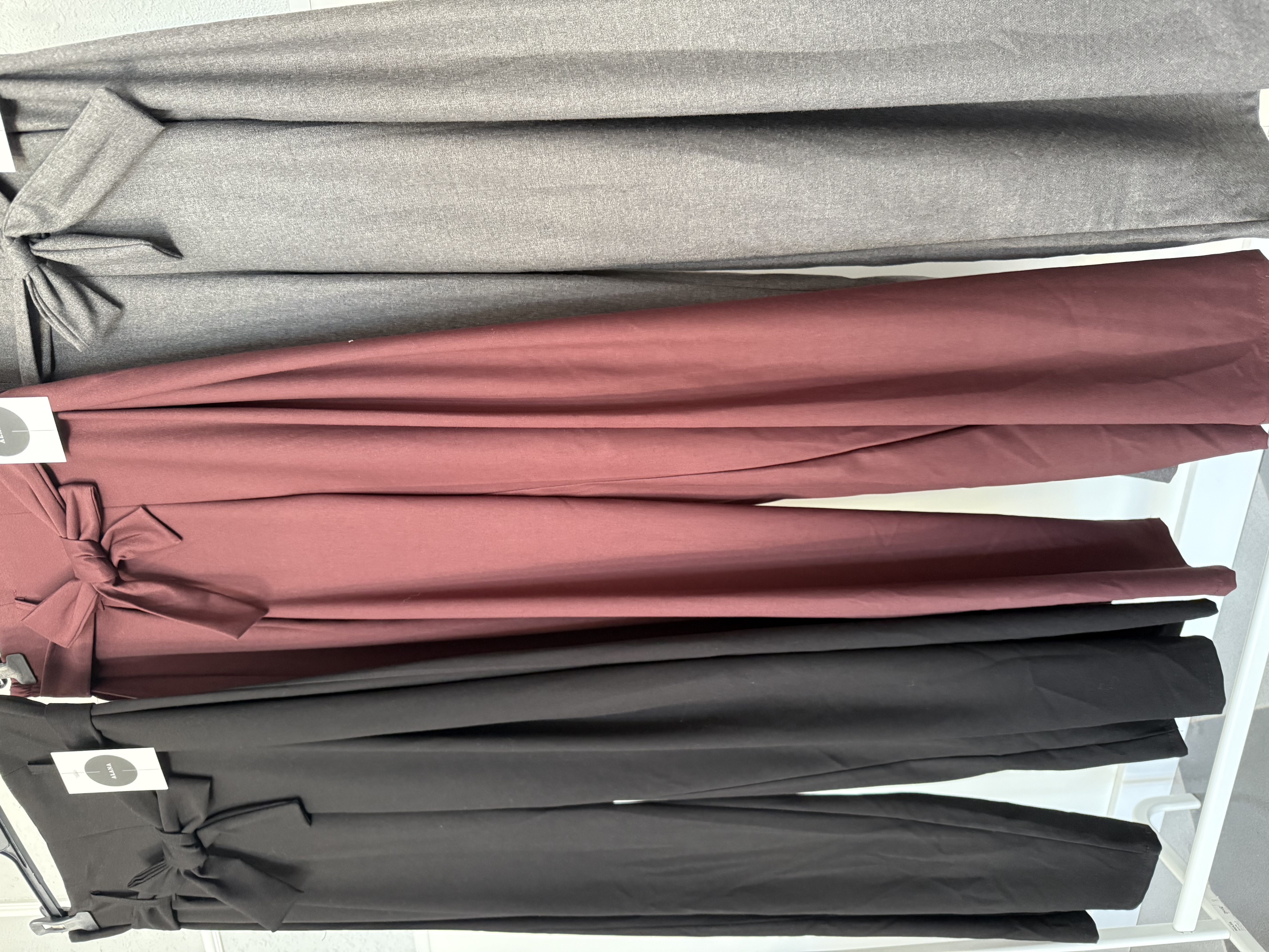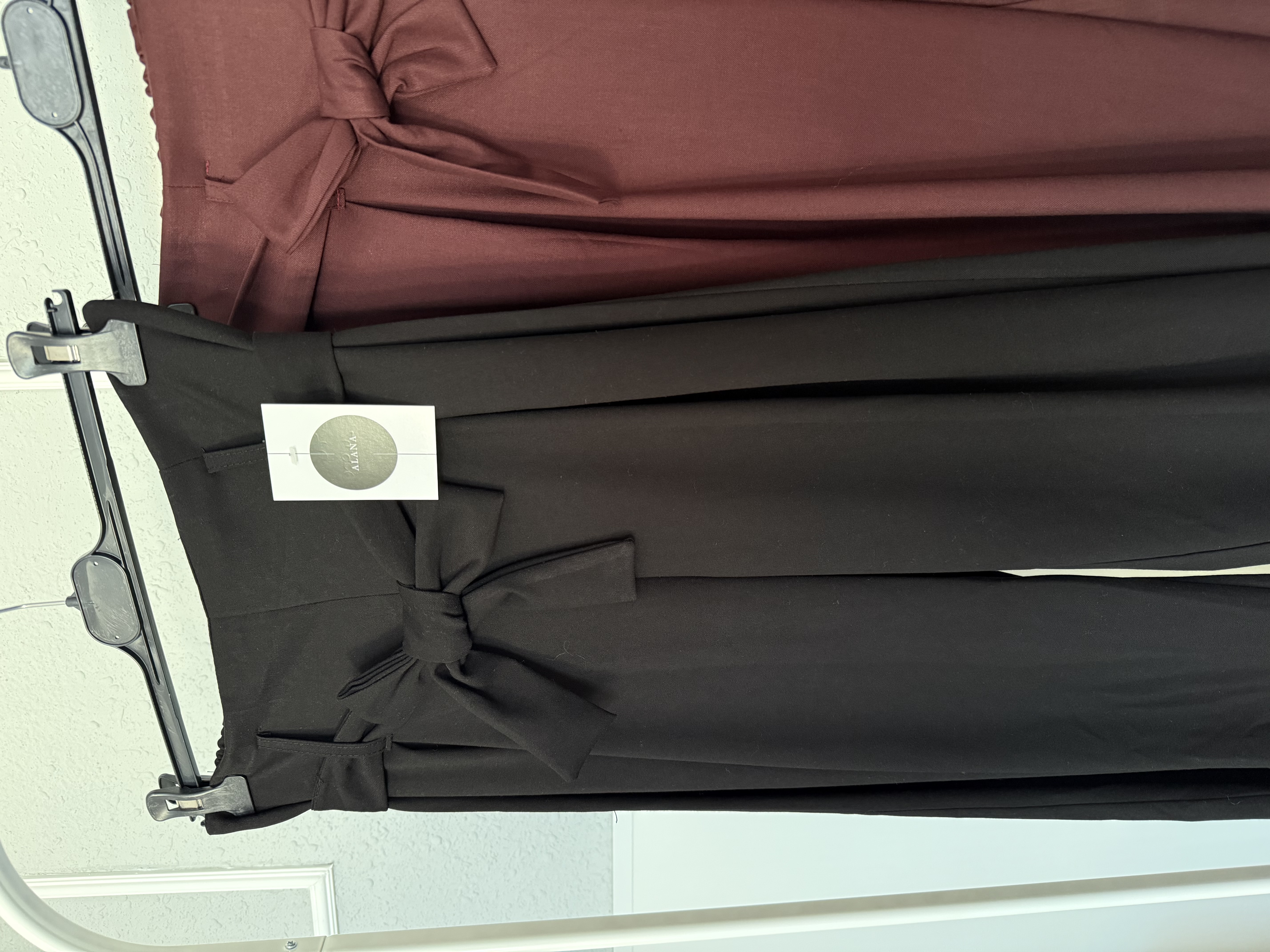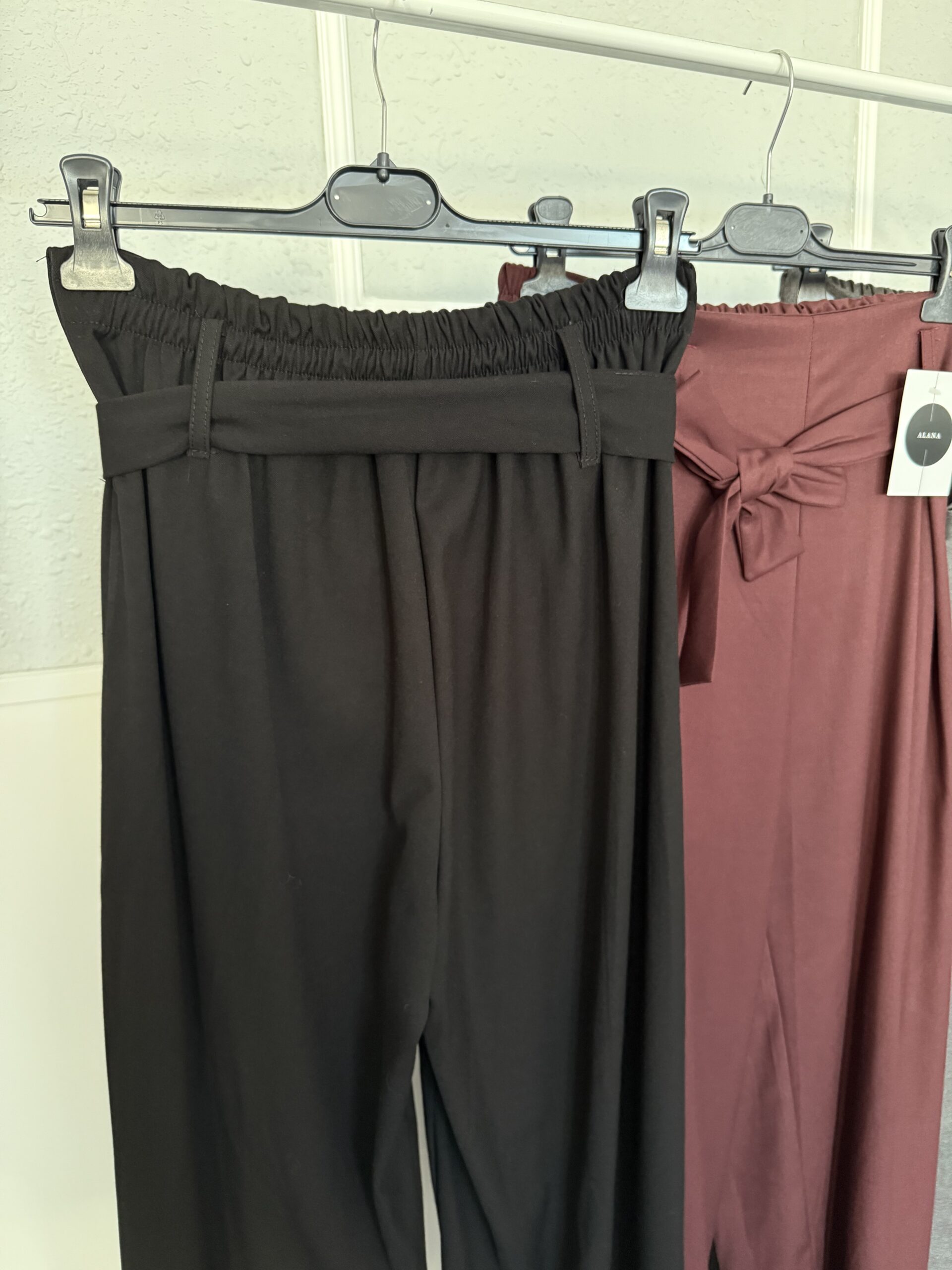 Pantalón tipo sastre con pinzas y tiro alto y detalle de la lazada en el mismo tejido, con talla única pero ceden hasta 46