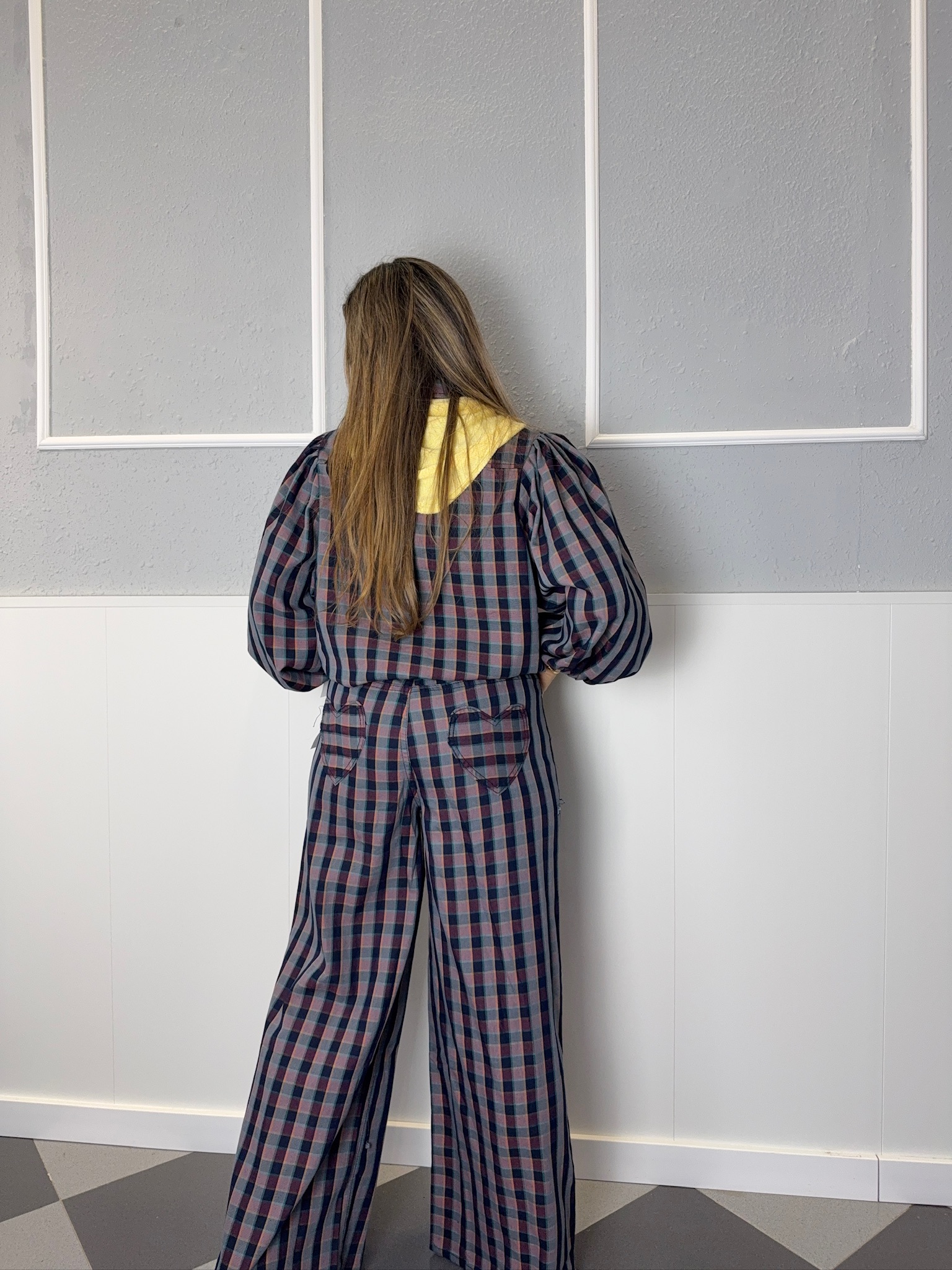 Divertido pantalón tejano con estampado de cuadros y bolsillos traseros en forma de corazón. Leva goma en la parte trasera del pantalón.
