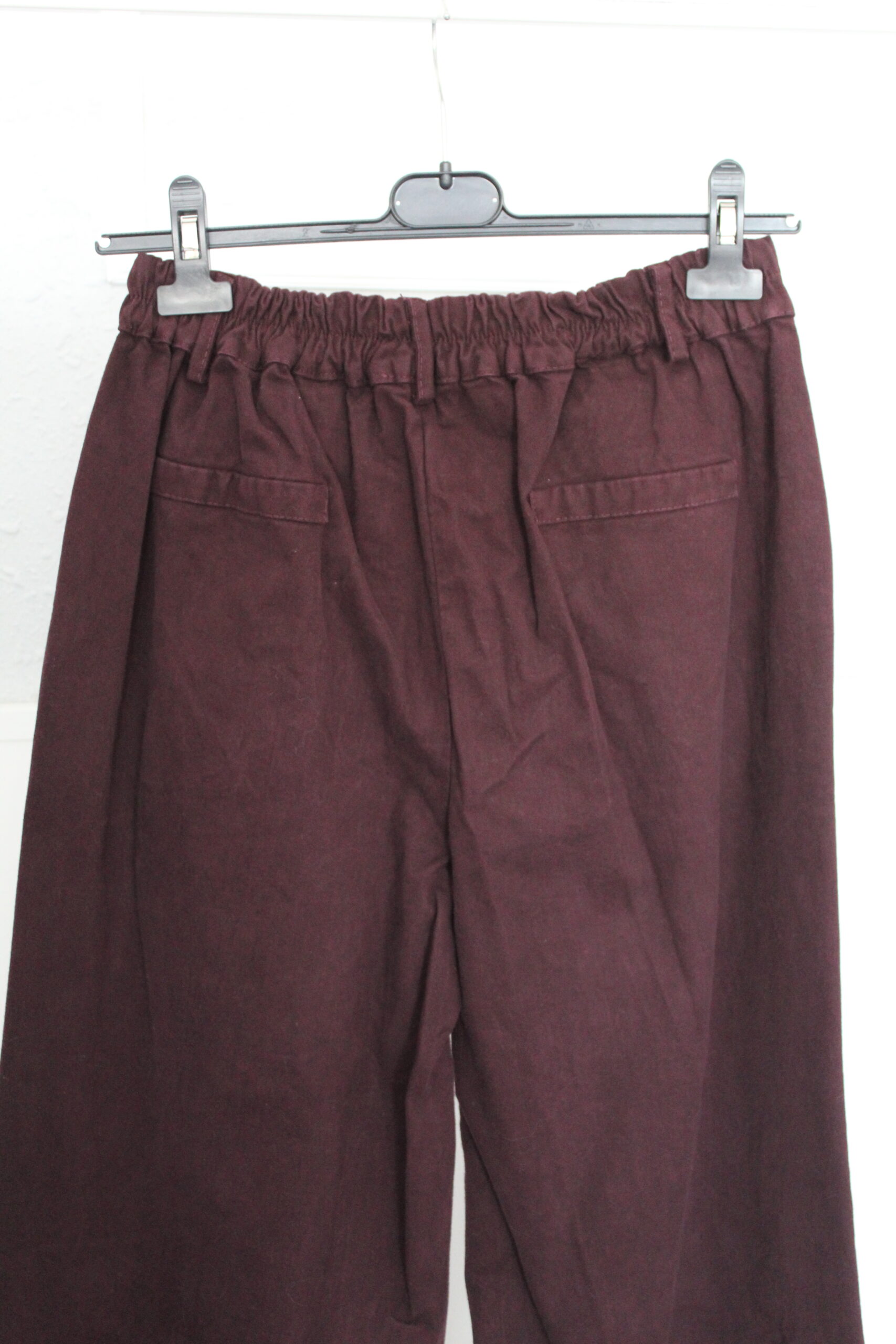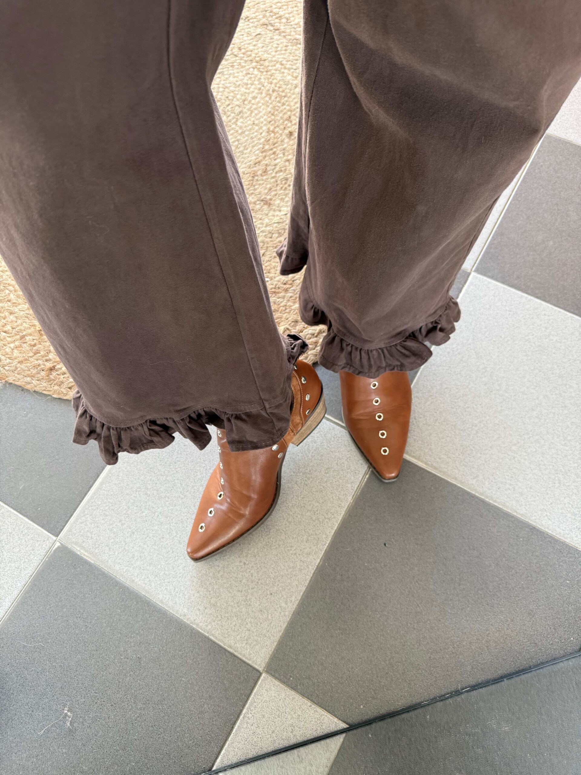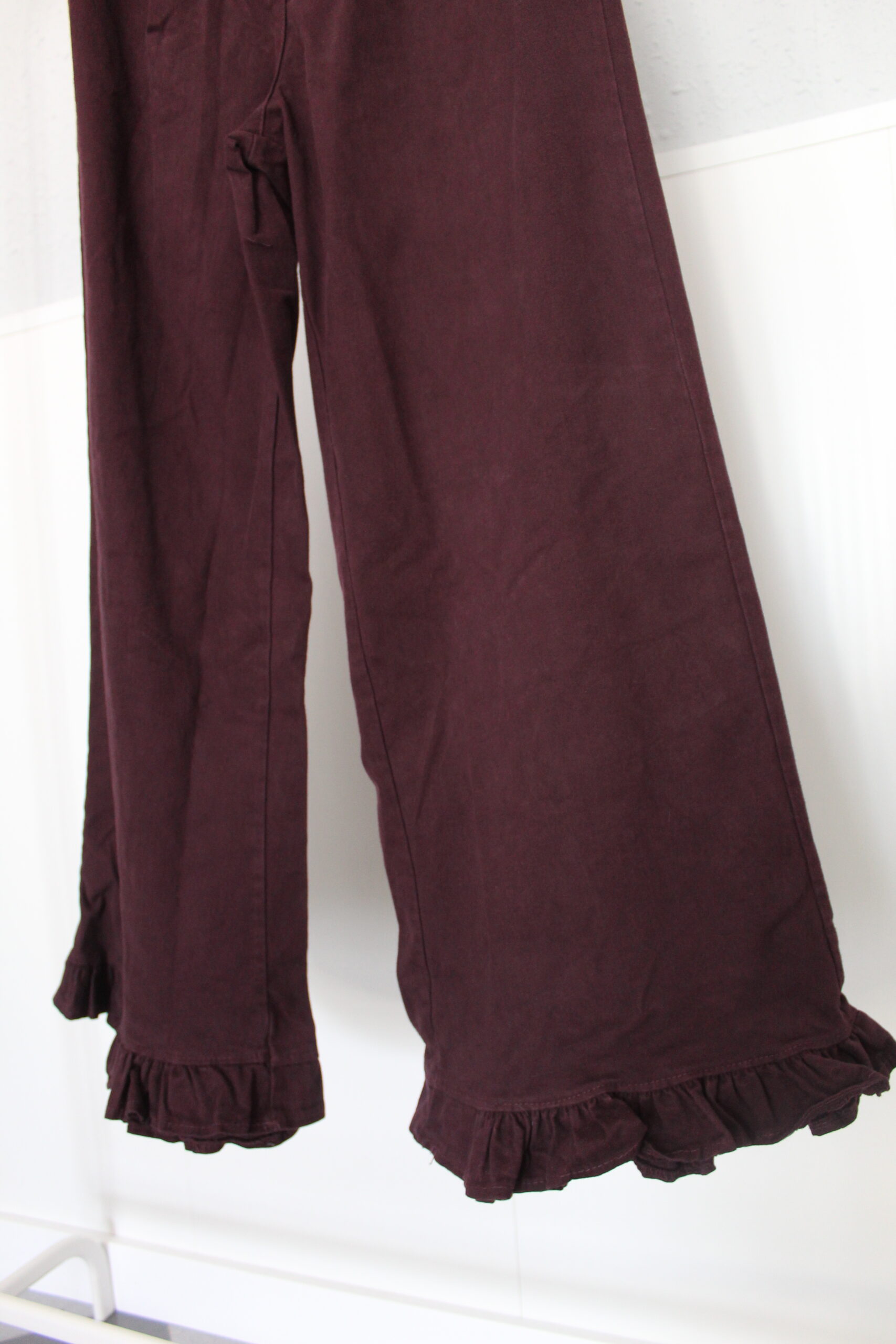 Pantalón con goma en la cintura, pinzas y cierre de botón. Detalle de volante en el bajo que le da un aire muy bonito y original.
