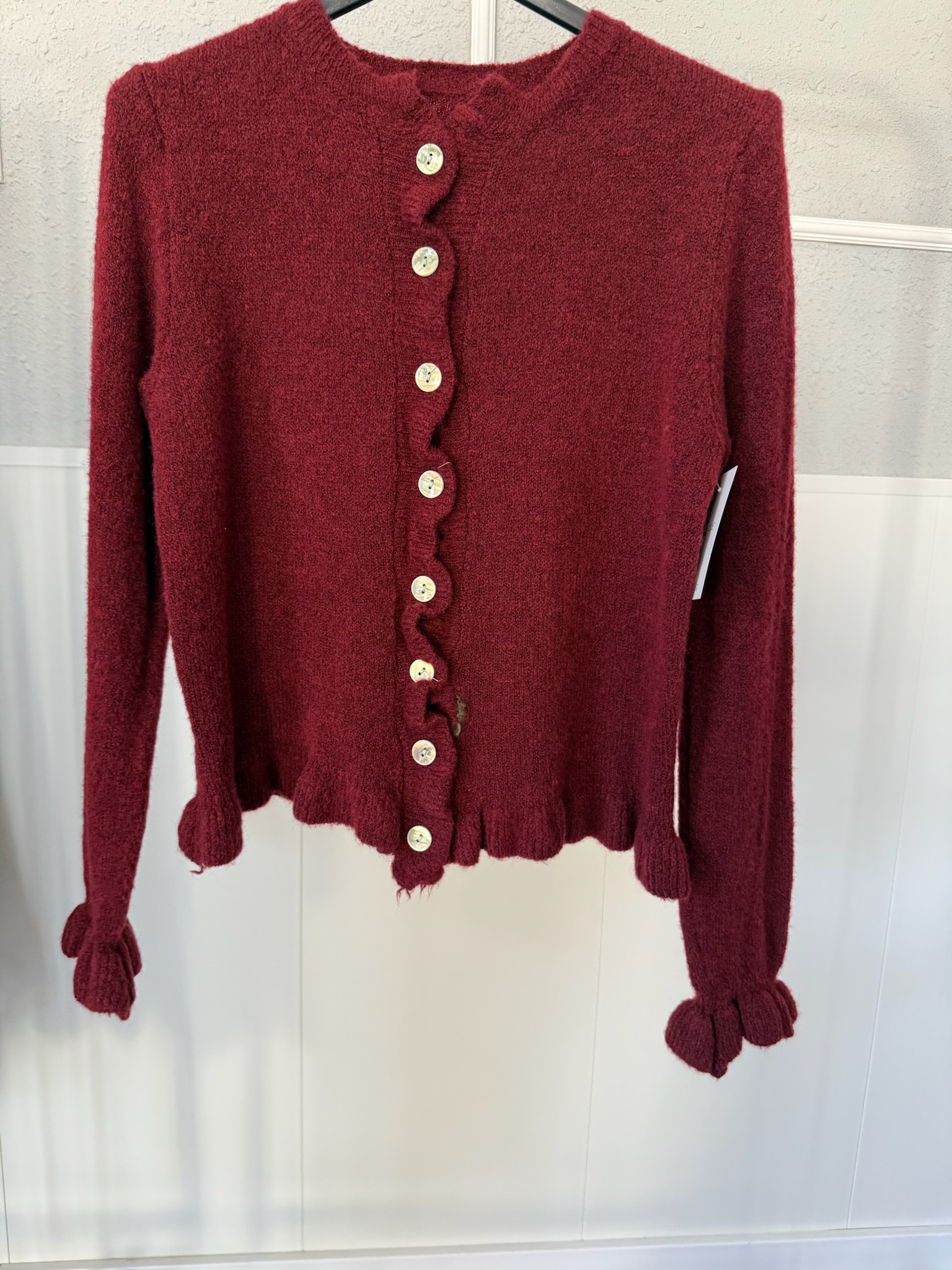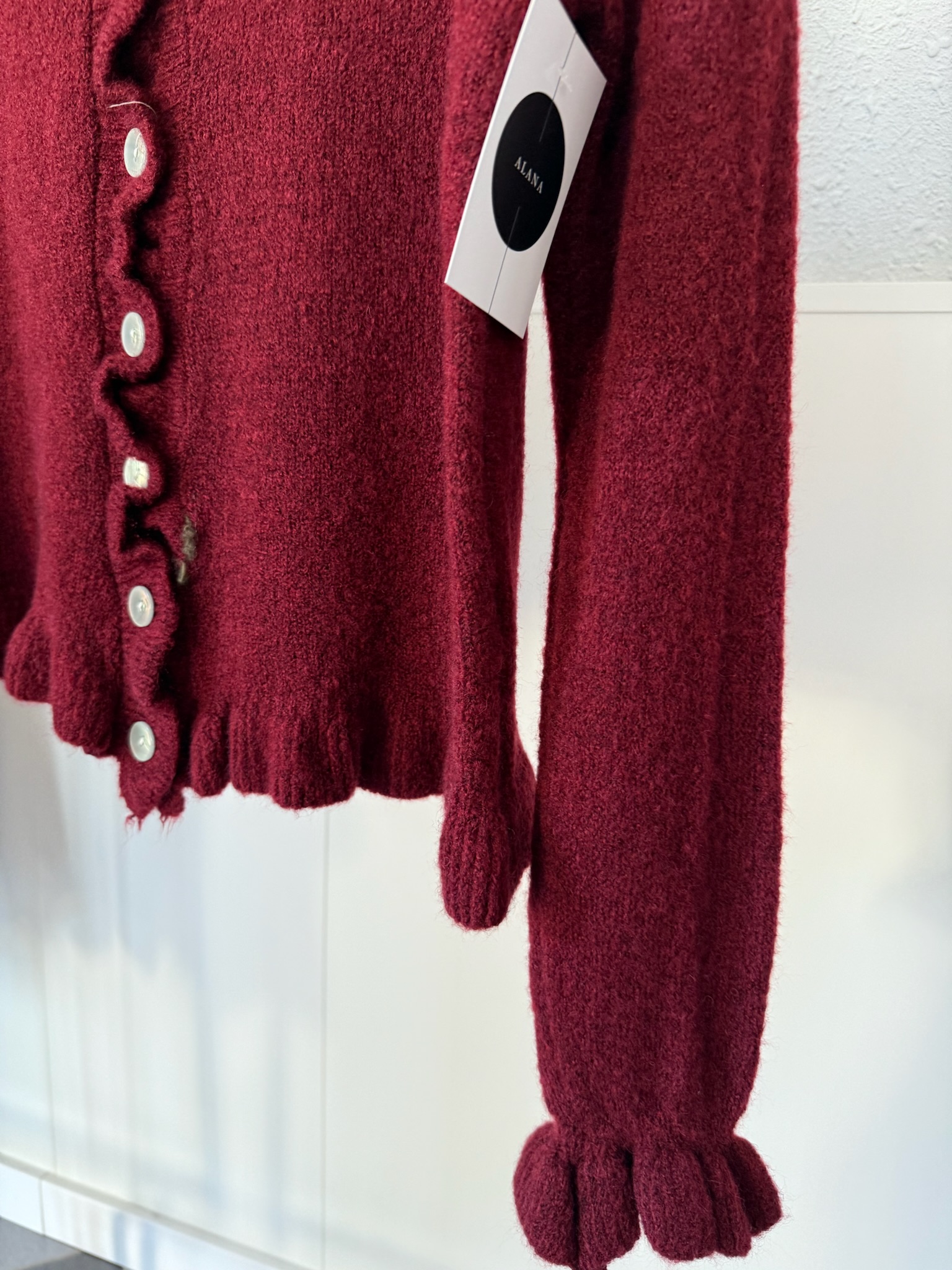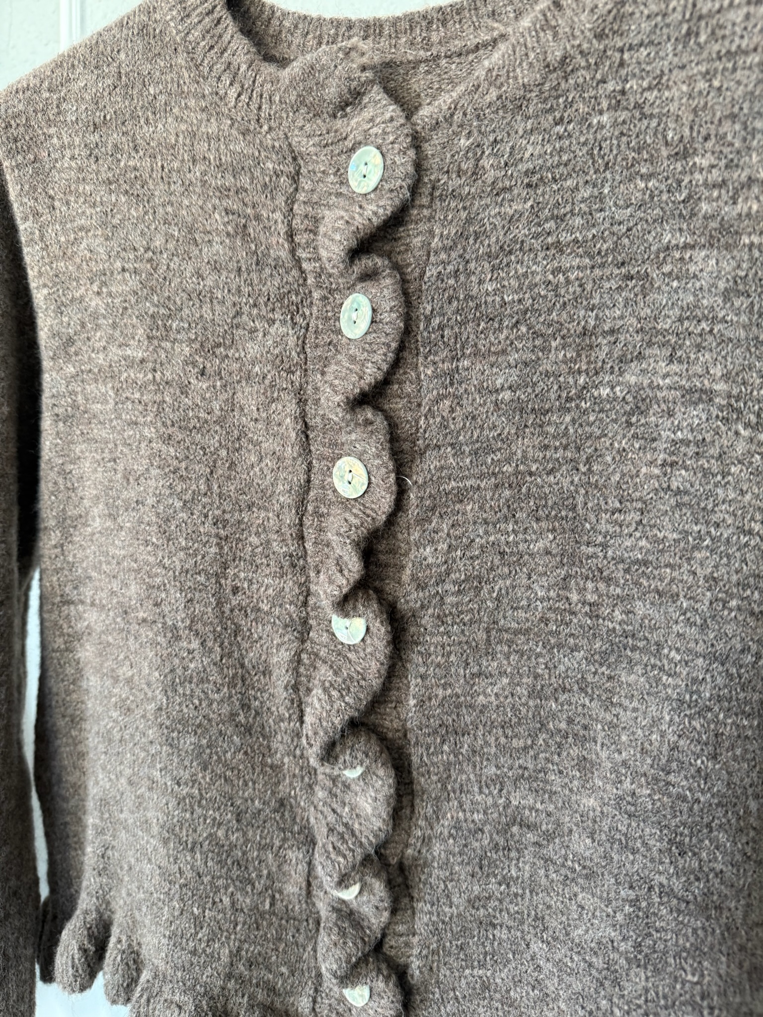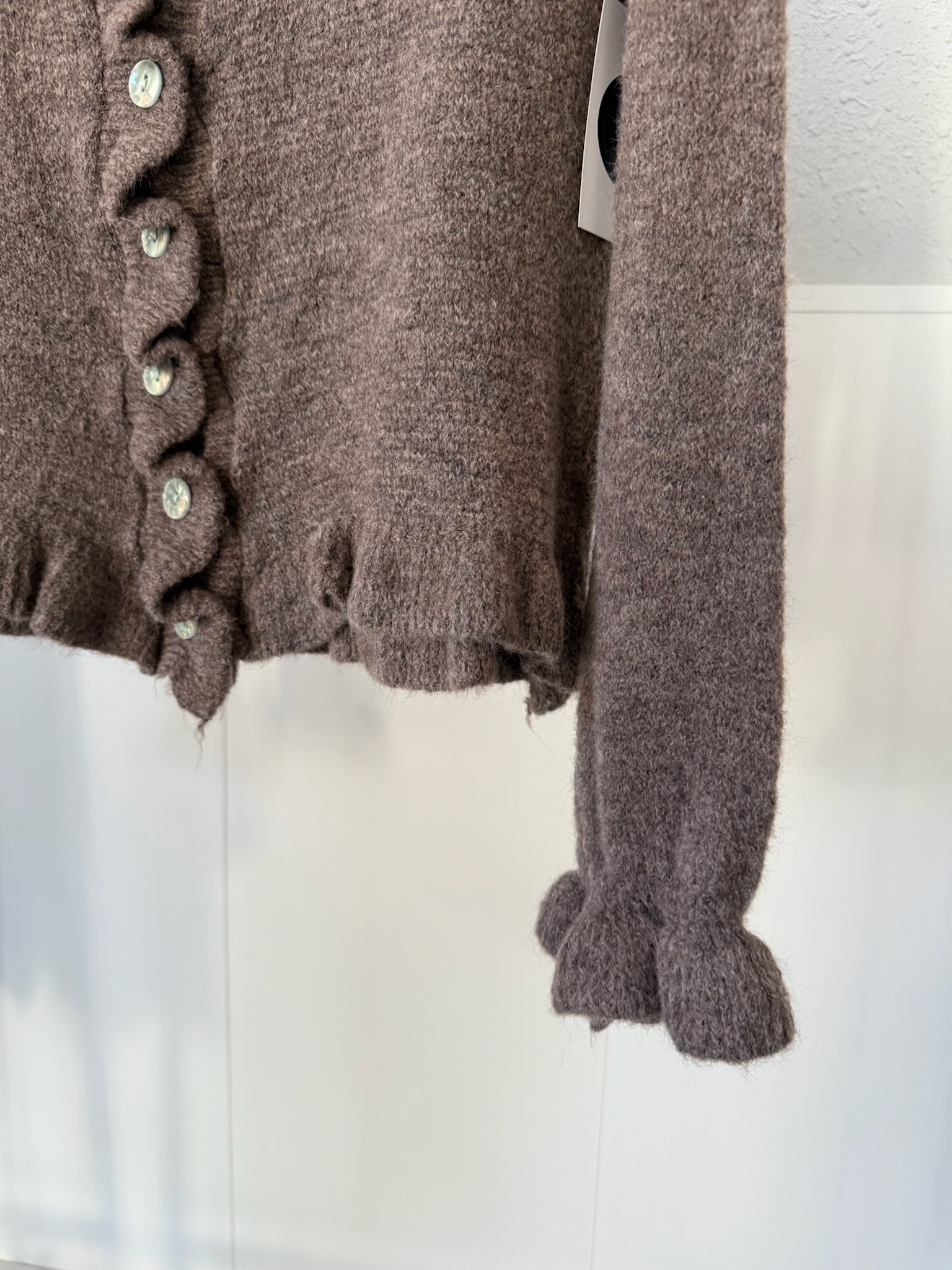 Rebeca de lana con detalle de volante en el pecho y en las mangas. Abotonada desde el cuello redondo.