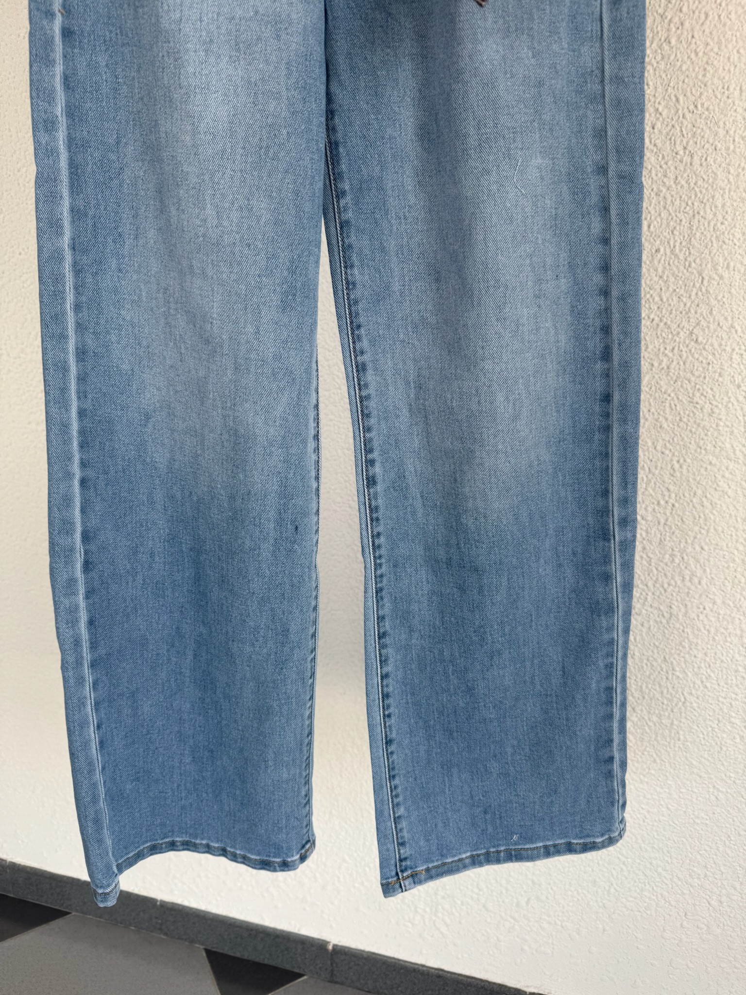Vaquero de tiro alto y pierna recta, con detalle del pañuelo en la cintura. Es desmontable por lo que puedes quitarlo y tener un vaquero básico que nunca pasa de moda. O ponerlo y darle un toque chic.