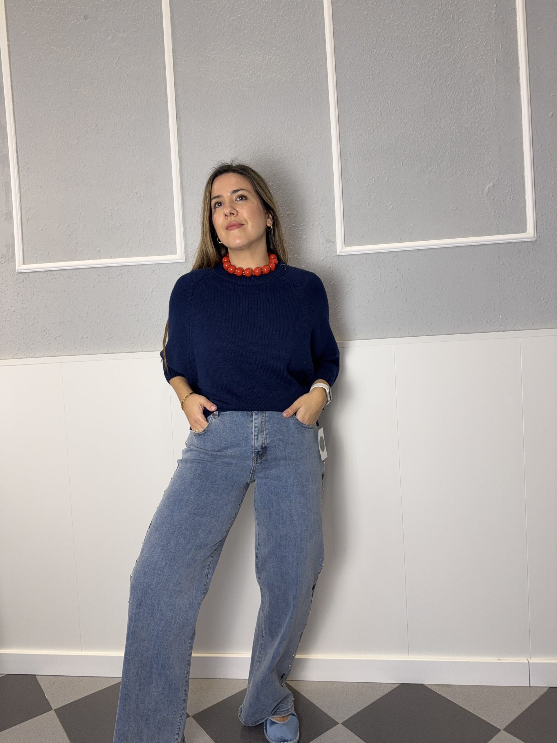 Con tachuelas y estrellas bordadas en la costura lateral. De tiro alto con elastano.