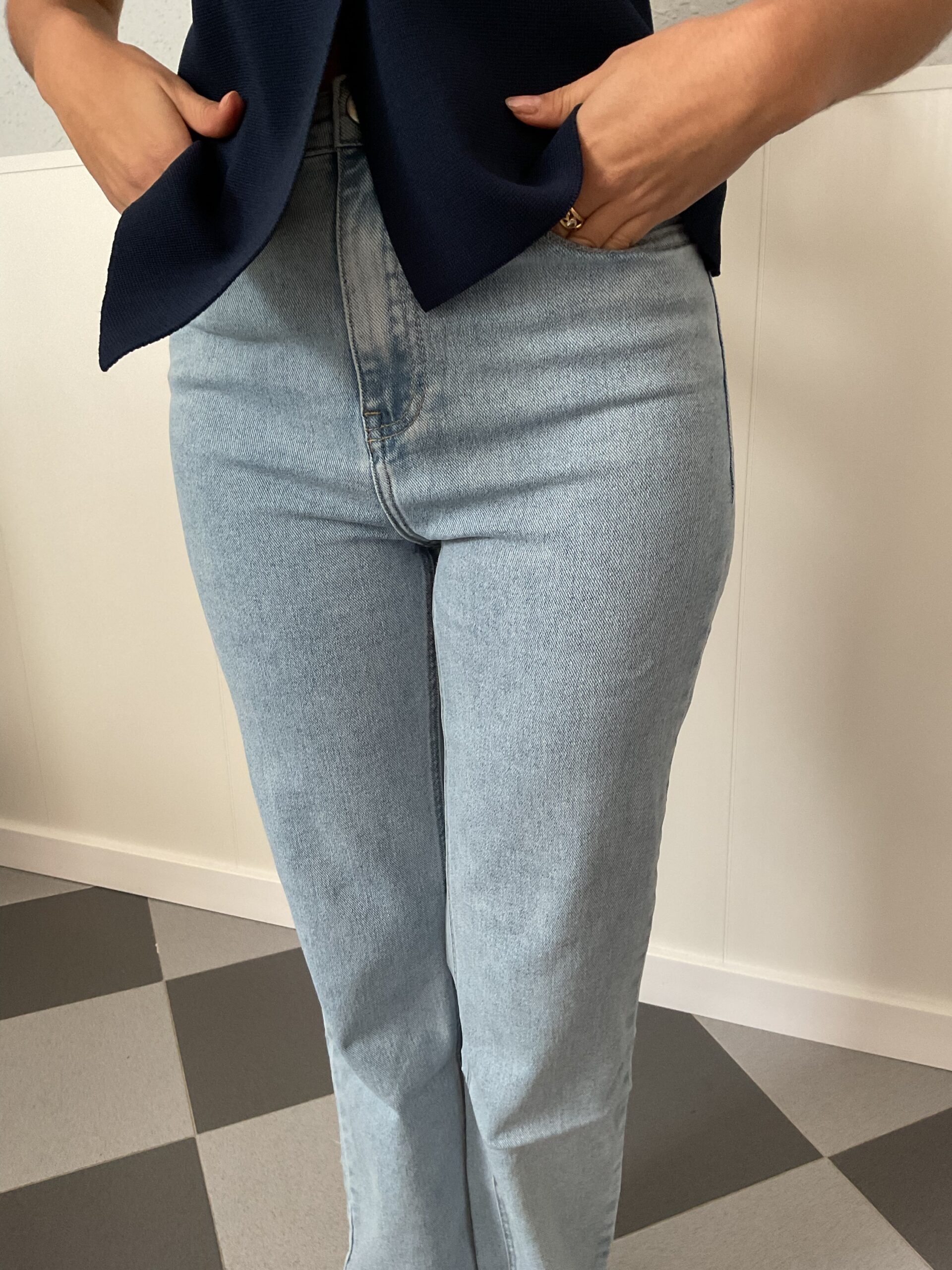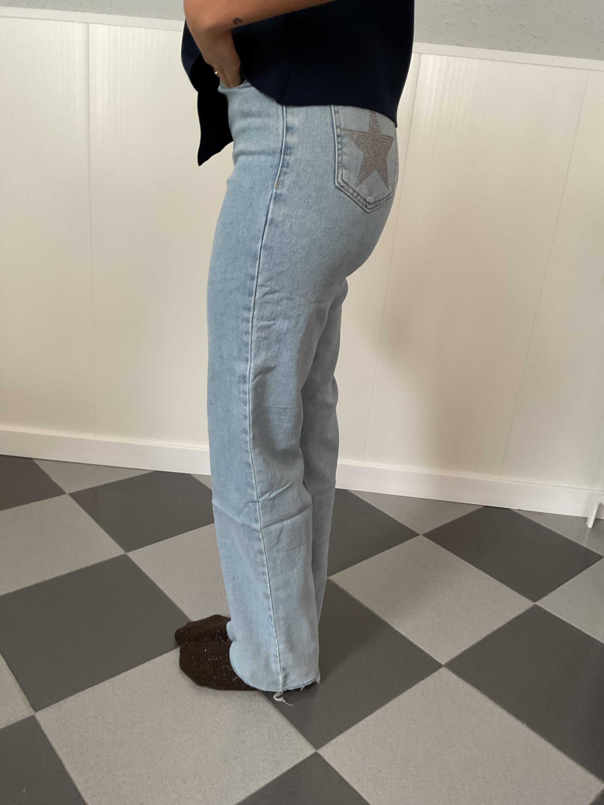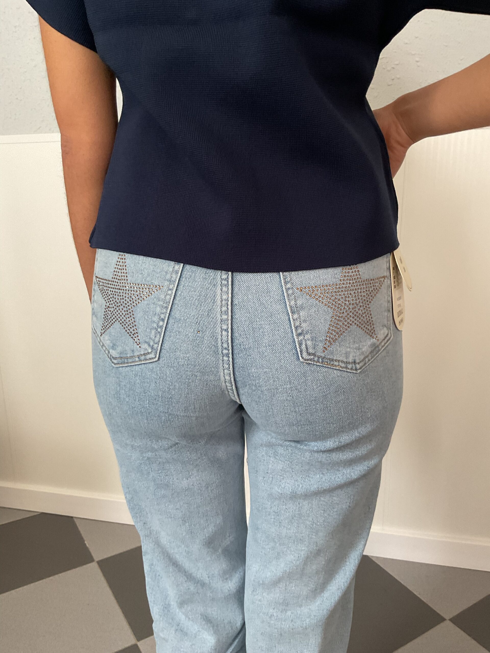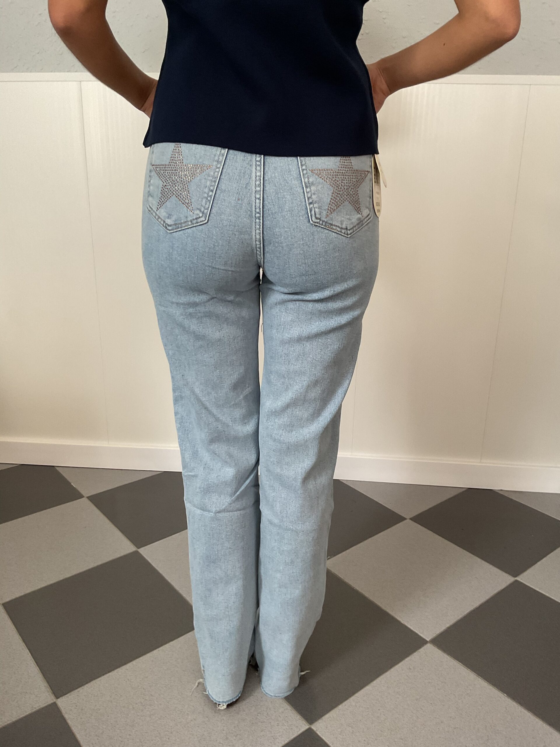 Vaquero de tiro alto con detalle de estrellas en los bolsillos traseros.