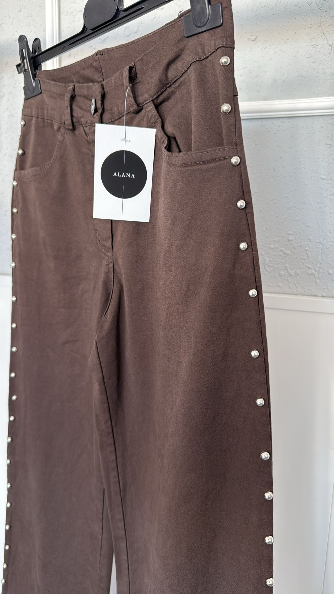 Pantalón denim en marrón con tachuelas en las costuras laterales y estrellas plateadas en los bolsillos traseros.